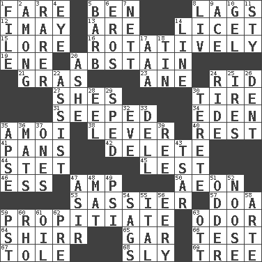 ACROSS 1. Conductor's collection 5. Benjamin's nick name 8. Fails to keep up a pace 12. "If ____ say so..." 13. "We ___ not amused" (Victoria) 14. It is permitted: Lat. 15. Old wives' tales, e.g. 16. Happening in regular succession 19. Compass dir. 20. Choose not to consume 21. Pate de foie ____ 23. One (Scot) 24. To free from 27. "______ My Girl" (Turtles hit) 30. Become fatigued 31. Oozed 34. Genesis locale 35. Mine, in Marseilles 38. Crowbar 40. Repose 41. Baking dishes 42. Erase 44. Proofreading order 45. For fear that 46. Curvy letter 47. Electrical Unit 50. Period of immesurable duration 53. More disrespectful 57. ___ good deed 59. Appease 63. Scent 64. Bake eggs in their shells 65. Slender fish 66. Trial 67. Lacquered or enameled metalware 68. Playfully artful 69. Family _ (genealogy) DOWN 1. Do some clerical work 2. Amid 3. More valued for its uncommonness 4. Sight organ 5. Sharp remark 6. Greek god of love 7. Remaining after all deductions 8. 54 in ancient Rome 9. Adept person 10. Set 11. Filthy place 14. Actor's bit 17. Auto club (abbr.) 18. Shallow baking pan 20. American tennis player Robert 22. Help 24. Travel on an animal 25. Angers 26. Gouge 28. Snakelike fish 29. Moved rapidly 30. Cylindrical with tapered ends 32. First lady 33. Small valley 35. Domed church section 36. Floor coverings 37. Washington bills 39. To sift 43. Russian ruler of old 47. SW Saudi Arabia district 48. Floor covering 49. Air pressure measure (abbr.) 51. More peculiar 52. Trap for birds or small mammals 54. Settles 55. Slanted text style (abbr.) 56. Suggestive of the supernatural 58. Johnson of "Laugh-In" 59. Pacific Standard Time (abbr.) 60. 17th letter of the Greek alphabet 61. Lubricate 62. Before (prefix) 63. Baseball player Mel