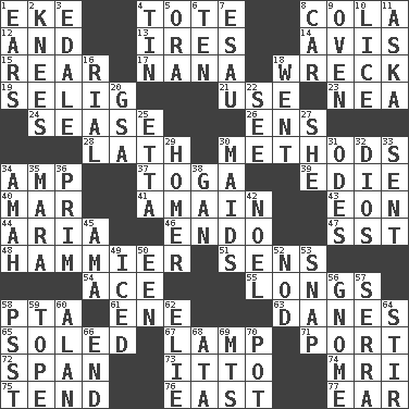 ACROSS 1. Make supply last 4. Haul 8. Root beer relative 12. Also 13. Angers 14. Opinion 15. Stern 17. Nanny 18. Raze 19. Former Milwaukee Brewers owner Bud 21. Purpose 23. Teachers' org. 24. Gospel singer Marvin 26. Followers of ems 28. Thin strip of wood or metal 30. Modes 34. Electrical Unit 37. Ancient Roman robe 39. Singer Brickell 40. Third mo. 41. At full speed 43. Age 44. Operatic vocal solo 46. Inside; within (prefix) 47. Fast jet (abbr.) 48. More overdramatic by comparison 51. Elected reps. 54. Adept person 55. Yearns 58. Parent Teacher Association (abbr.) 61. Compass dir. 63. Natives or inhabitants of Denmark 65. Having a sole or soles 67. Desk light 71. Left side of a ship or aircraft 72. Connect, as a bridge 73. "Tell ____ the Marines!" 74. Medical imaging device (abbr.) 75. Look after 76. Compass direction 77. Hearing organ DOWN 1. Hearing organs 2. Leg joints 3. Peak District village in England 4. Shallow baking pan 5. Mouth or opening 6. Nine, plus one 7. Son of Isaac 8. Auto 9. Baking chamber 10. Louse (plural) 11. "____ silly question..." 16. Monetary unit of Yemen 18. Gone 20. Girls' org. (abbr.) 22. Observe 25. Singer James 27. A female animal or person 29. Homing pigeon 30. Women servants 31. Lyric poems 32. "Vaya con ____" 33. Emitted 34. Nursemaid 35. Hindu Mythology: god of death 36. Demure 38. Separate the seeds from cotton 42. Christmas carol 45. Wet nurse (var.) 49. On the rocks 50. Car or cant ending 52. Lower and raise head in agreement 53. Fastener 56. Dwarf 57. Father Junipero _ 58. Inconspicuous attention getter 59. Drink excessively 60. ____ Jay Lerner 62. Writer Wiesel 64. Move through with a circular motion 66. Conclusion 68. _ moment's notice (2 wds.) 69. Mountains (abbr.) 70. Plant holder