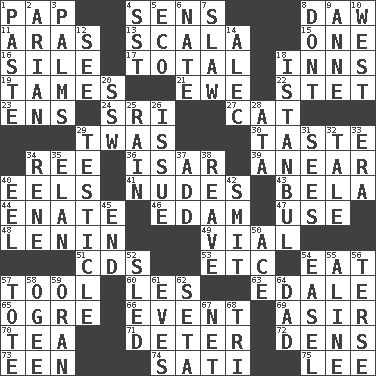 ACROSS 1. Infant food 4. Elected reps. 8. Obsolete 11. Ancient river in northeast Turkey 13. Any of the three canals of the cochlea 15. Single 16. Filth; sediment 17. "_____ Recall" 18. Taverns 19. Domesticates 21. She-sheep 22. Proofreading order 23. Followers of ems 24. _ Lanka 27. Feline 29. It was, poetically 30. Clothes sense 34. To separate or throw off 36. Austrian river, tributary to the Danube 39. Approach 40. Snakelike fish 41. Unclothed pictures 43. Actor Lugosi 44. Maternal 46. Dutch treat 47. Purpose 48. Soviet premier 1918-24 49. Small bottle 51. Music discs 53. And so on (abbr.) 54. Ingest 57. Implement 60. French article 63. Peak District village in England 65. Legendary monster 66. Happening 69. SW Saudi Arabia district 70. Afternoon social gathering 71. Prevent from occurring 72. Lairs 73. Car or cant ending 74. Suttee (variant) 75. Area sheltered from the wind DOWN 1. Thick mixture 2. Believer in; advocate of (suffix) 3. Insides of hands 4. Fast jet (abbr.) 5. Environmental prefix 6. Nathan's nickname 7. Cole _ (cabbage dish) 8. Do not 9. Singer Murray 10. 270 degrees 12. Observe 14. Actor Baldwin 18. Byzantium, centuries later 20. Compass dir. 25. Water falling in drops from the sky 26. Come out of 28. _ moment's notice (2 wds.) 29. One of the two male reproductive glands 31. Perceives with the eye 32. Falsehood 33. Epoch 34. French philosopher Descartes 35. Style 37. Say or write further 38. Break or tear apart 40. Snakelike fish 42. Stricken, poetically 45. Conclusion 50. Adept person 52. Downhill vehicle 54. Artist's stand 55. Place in a line 56. Laconic 57. Lug 58. Double curve, resembling the letter S 59. Northwest Algerian city 61. Nights before holidays 62. Stalk of a moss capsule 64. June honoree 67. Fish or hair follower 68. Three (prefix)