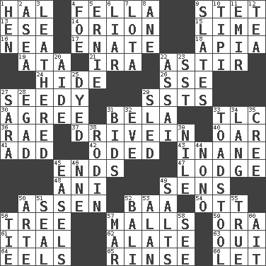 ACROSS 1. Actor Linden 4. Chap (slang) 9. Proofreading order 13. Compass dir. 14. Greek mythologigal hunter 15. Welles in "The Third Man" 16. Teachers' org. 17. Maternal 18. Capital of Western Samoa 19. _ moment's notice (2 wds.) 21. Retirement account (abbr.) 22. Moving about 24. Flintstone garb 26. Compass dir. 27. Shabby and untidy 29. Fast planes 30. Match 31. Actor Lugosi 33. Affectionate concern, for short 36. Actress Charlotte 37. Popular '50s hangout 40. Boat paddle 41. Increase 42. Wrote a lyric poem 43. Silly 45. Extremities 47. Cabin 48. Black tropical American cuckoo 49. Elected reps. 50. NE Netherlands city 52. Sound made by sheep 54. Baseball player Mel 56. Family _ (genealogy) 57. Shopping centers 59. Mouth or opening 61. Slanted text style (abbr.) 62. Having winglike extensions 63. Fr. "Yes" 64. Snakelike fish 65. Remove soap 66. Allow DOWN 1. Layer 2. Toward the sea 3. Resembling or made to resemble leather 4. Enemy 5. Bert's buddy 6. One who doesn't tell the truth 7. Globular water bottle used in Asia 8. A saturated hydrocarbon 9. Chalkboards 10. Native american tent (variation) 11. Independent ruler or chieftain 12. Beverage made from leaves 20. Assistant 22. Slender Brazilian palm 23. Fast jet (abbr.) 25. Colored 27. "Two Mules for Sister ____" 28. Mild oath 29. Downhill vehicle 31. Auction offers 32. First lady 33. Inedible or poisonous agaric 34. Austrian-born American filmmaker Fritz 35. Algonquian 38. "The Thinker" sculptor 39. Mediterranean tributary 44. Words to Nanette 45. Artist's stands 46. Compass dir. 49. Table seasonings 50. Johnson of "Laugh-In" 51. Lick closed 52. Indonesian resort city 53. ____ Jay Lerner 55. Loyal 56. Standoff 57. Impair 58. Perceive with the eye 60. Small island