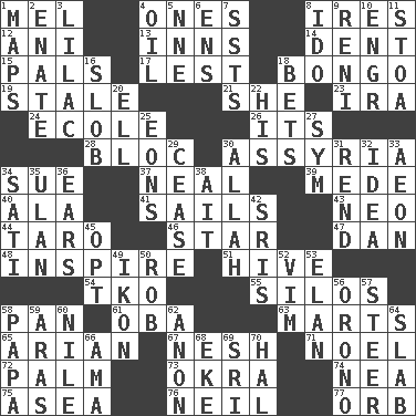 ACROSS 1. Cartoonist voice _ Blanc 4. Washington bills 8. Angers 12. Black tropical American cuckoo 13. Taverns 14. Gouge 15. Friends 17. For fear that 18. Beat drum 19. Having lost freshness 21. A female animal or person 23. Retirement account (abbr.) 24. Learning spot: Fr. 26. It is 28. Group of countries in special alliance 30. Nineveh was its capital 34. Institute legal proceedings 37. Actress Patricia 39. Ancient Persian 40. According to 41. Travel by water 43. Modern: prefix 44. Pacific island yam 46. Play the lead 47. Daniel's nick name 48. Stimulate to action 51. Hub of activity 54. Ring climax 55. Grain storage towers 58. Baking dish 61. Chief or king in Benin or Nigeria 63. Shops 65. Believer in; advocate of (suffix) 67. Delicate 71. Christmas carol 72. Inside of hand 73. Gumbo ingredient 74. Teachers' org. 75. Toward the sea 76. Famous astronaut Armstrong 77. Globe DOWN 1. Atlas contents 2. Maternal 3. Pale purple color 4. Petroleum 5. Compass dir. 6. Followers of ems 7. Fast planes 8. Wedding promise 9. Painter Guido (1575-1642) 10. Engineer (abbr.) 11. Portico 16. Oscar Madison type 18. Stakes 20. Pipe bend 22. Part of HMS, perhaps 25. Immeasurably long periods of time 27. Symbol (abbr.) 29. Desist 30. Assad's deity 31. Tear apart 32. The content of cognition 33. Age 34. Suttee (variant) 35. ____ Bator 36. Hearing organs 38. Small island 42. Indian titles of respect 45. Choose 49. Visual representation of an object 50. Director Reiner 52. Zeal 53. Style 56. U. of Maine site 57. Navigate 58. Dad 59. Ancient river in northeast Turkey 60. The longest river in the world 62. At once, immediately (arch.) 64. Thick slice 66. Nanny (var.) 68. Make supply last 69. _ Lanka 70. Actor Linden