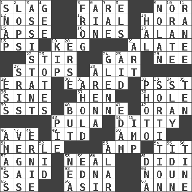ACROSS 1. Volcanic refuse 5. Conductor's collection 9. And not 12. Sense of smell 13. Monetary unit of Yemen 14. Israeli folk dance 15. Domed church section 16. Singles 17. ____ Jay Lerner 18. Air pressure measure (abbr.) 19. Cask 21. Having winglike extensions 22. Use a spoon 24. Slender fish 26. Born 27. Constricts 28. Came down and settled, as after flight 29. Part of Q.E.F. 30. Having ears or earlike features 32. Inconspicuous attention getter 36. Trig term 37. Layer 38. Opening into or through something 39. Fast planes 40. Maid-servant 42. Northwest Algerian city 43. Monetary unit of Botswana 44. Short, simple song 46. "___ Maria" 49. It would 50. Mine, in Marseilles 51. Haggard of country music 53. Electrical Unit 54. Teat (slang) 57. Hindu god of fire 58. Actress Patricia 61. "You Light Up My Life" star Conn 62. Alleged 63. Pulitzer Prize-winning author Ferber 64. Part of speech 65. Compass dir. 66. SW Saudi Arabia district 67. Queen of England 1702-14 DOWN 1. Fastener 2. Chops off 3. Aide 4. Unit of force equal to gravity 5. Tree-dwelling hopper 6. The 18th letter of the Arabic alphabet 7. Actress Charlotte 8. Raised railways 9. Pitcher Ryan 10. Speak pompously 11. The wife of a rajah (variant) 14. Actor Linden 19. Monetary unit of Laos 20. Celtic language 21. Tate display 23. Lugs 24. American astronaut and politician John 25. Help 27. Indian titles of respect 28. Sports stadium 29. Double-curved letter 31. Hold, grip (Informal) 32. Picture 33. Determination 34. Kill 35. "___ Little Indians" 40. On the contrary 41. Dutch treat 43. Sliced dessert 45. Mischievous child 46. Collect or gather 47. Viva Las _ 48. Bert's buddy 52. Flaplike covering 53. Having or resembling wings 55. Goddess of spring and wife of Bragi 56. Prong on a fork 58. Teachers' org. 59. Begley and Asner 60. Black tropical American cuckoo 61. Heredity factor (abbr.)