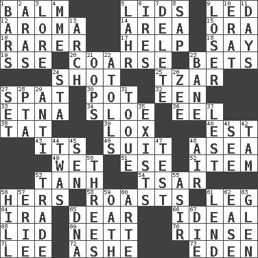ACROSS 1. Lip ointment 5. Hats (slang) 9. Directed 12. Scent 14. Length times width 15. Mouth or opening 16. More valued for its uncommonness 17. Assist 18. Declare 19. Compass dir. 20. Rough 23. Wagers 24. Opportunity 25. Czar 27. Petty quarrel 30. Cooking vessel 32. Car or cant ending 33. Inactive volcano in Sicily 34. _ gin 36. Snakelike fish 38. Make lace 39. Brine-cured salmon 40. Eastern Standard Time (abbr.) 43. It is 46. Costume for a special activity 48. Toward the sea 49. Dripping 51. Compass dir. 52. A whole individual unit 53. Hyperbolic tangent 54. Russian ruler of old 56. Possessive pronoun 58. Cooks with dry heat, as in an oven 61. Part of a journey 64. Lyricist Gershwin 65. Letter starter 66. Perfect 68. Flaplike covering 69. Remaining after all deductions 70. Remove soap 71. Area sheltered from the wind 72. American tennis player Robert 73. Genesis locale DOWN 1. Oblong pieces of solid material 2. Caspian sea tributary 3. Old wives' tales, e.g. 4. Madame (abbr.) 5. Cowardly lion portrayer 6. Angers 7. Erase 8. Plant excrement 9. Failure 10. Part of Q.E.F. 11. 24-hour periods 13. Bowlike part 21. I made a mistake 22. Ringlike coral islands and reefs 23. Object of repulsion 24. R.R. building 26. Last letter of the English alphabet 27. Arrange properly for use 28. Parent Teacher Assoc. 29. Against 31. Woman's close-fitting hat 35. Is 37. For fear that 41. Observe 42. Scottish cap 44. It was, poetically 45. Elected rep. 47. Trial 48. Atmosphere 50. Threesomes 53. Buy and sell 55. SW Saudi Arabia district 56. Land elevation 57. One of the Great Lakes 59. Pledge 60. Johnson of "Laugh-In" 61. Grant temporary use of 62. Relaxation 63. Small, secluded valley 65. Heredity factor (abbr.) 67. Pass on