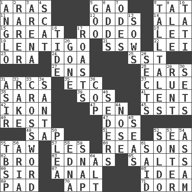 ACROSS 1. Caspian sea tributary 5. E Mali city 8. Make lace 11. Drug cop 12. Likelihood 14. In the manner of 15. Relatively large 17. Cowboy competition 18. Allow 19. Small, flat, pigmented spot on the skin 21. Compass dir. 22. Luau accessory 23. Mouth or opening 24. ___ good deed 25. Fast jet (abbr.) 27. Followers of ems 28. Hearing organs 31. Curves 35. And so on (abbr.) 37. A slight indication 38. "Two Mules for Sister ____" 39. Distress signal 41. Portable shelter 42. Image 43. Writing instrument 45. Fast planes 46. Respite 47. Two (Sp.) 49. Plant excrement 51. Compass dir. 52. Ocean 55. The 23rd letter of the Hebrew alphabet 57. French article 60. Thinks logically 62. Sis' sibling 63. Ferber et al. 65. Table seasonings 66. Title for a knight 67. Of or related to the anus 68. It may be bright or harebrained 69. Groovy apt. 70. Fitting 71. Dormintory (informal) DOWN 1. White American of non-Hispanic descent 2. More uncommon 3. Sports stadium 4. Scram, to a cat 5. Thick or sticky substance 6. Sums up 7. Lyric poems 8. Baron Munchausen's specialties 9. Toward shelter 10. Jacques of French films 13. Sty mamas 16. Event that recurs at intervals 17. Cooks with dry heat, as in an oven 20. Went 26. Religious groups 29. Undersized animal 30. Arranges properly for use 31. SW Saudi Arabia district 32. Libertine 33. What you're doing now 34. Before Barbara or Clara 36. Police officer (slang) 40. Spring feasts 44. Sense of smell 48. Oceans 50. Entreaty 52. Twentieth part of a lira 53. Keyboard key 54. Indian state 55. Cook's measure (abbr.) 56. Roberta Peters solo 58. Pulitzer Prize-winning author Ferber 59. Fastener 61. Expressed in words 64. The first octave above the treble staff