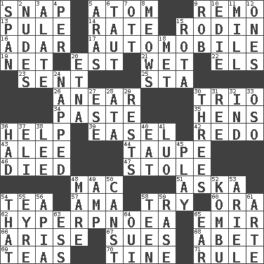 ACROSS 1. Fastener 5. Tiny particle 9. San ____ (Riviera town) 13. Whimper 14. Assign a rank or rating to 15. "The Thinker" sculptor 16. The sixth month of the Jewish calendar 17. Car 19. Fish or hair follower 20. Eastern Standard Time (abbr.) 21. Soggy 22. Raised railways 23. Transmitted 25. R.R. building 26. Approach 30. Musical group of three 34. Thick mixture 35. Coop moms 36. Assist 39. Artist's stand 42. Redecorate 43. Toward shelter 44. Grayish beige 46. Passed on 47. Fur scarf 48. Apple computer (short form) 51. "____ silly question..." 54. Beverage made from leaves 57. Wet nurse (var.) 58. Attempt to accomplish something 60. Mouth or opening 62. Abnormally rapid or deep breathing 65. Arab leader 66. Originate 67. Institutes legal proceedings 68. Collude with 69. Afternoon social gatherings 70. Prong on a fork 71. Court order DOWN 1. Connect, as a bridge 2. Unclothed pictures 3. Having winglike extensions 4. For each 5. Caspian sea tributary 6. Strained 7. Baseball player Mel 8. Catcalls? 9. Director Reiner 10. Singer Brickell 11. Place where flour is made 12. Washington bills 15. Roll call or roster of names 18. Was introduced to 20. Inactive volcano in Sicily 24. Slept 27. Compass dir. 28. _ moment's notice (2 wds.) 29. Musical pauses 30. Trios 31. To sift 32. Working for oneself (abbr.) 33. Bear (Spanish) 36. Possessed 37. Connecticut Ivy Leaguer 38. Area sheltered from the wind 40. Erode 41. Nilotic language 45. Frolic 48. Female horse 49. Electrical Unit 50. 2nd pers. sing. pres. of can (arch.) 52. Dried seaweed eaten as food 53. Satellite of Uranus 54. Not this but _ 55. Jane of fiction 56. Capital of Western Samoa 58. Adolescent 59. To erase 61. Johnson of "Laugh-In" 63. Curvy letter 64. Fr. "Yes" 65. Ewer handle