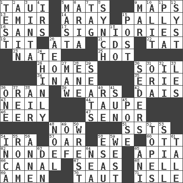 ACROSS 1. "Change" in Tahitian 5. Floor coverings 9. Atlas contents 13. Arab leader 14. Like ___ of sunshine 15. Chummy 16. Without 17. Seigniories (variant) 19. Teat (slang) 20. _ moment's notice (2 wds.) 21. Music discs 22. Make lace 23. Nathan's nickname 25. Being at a high temperature 26. Residences 30. The visible part of the earth's surface 34. Empty; void 35. One of the Great Lakes 36. Northwest Algerian city 39. Puts on (as clothing) 42. Raised platform 43. Famous astronaut Armstrong 44. Grayish beige 46. Suggestive of the supernatural 47. Sir (Sp.) 48. At this time 51. Fast planes 54. Retirement account (abbr.) 57. Boat paddle 58. She-sheep 60. Baseball player Mel 62. Unrelated to defense, as in spending 65. Capital of Western Samoa 66. Lessep's creation 67. Oceans 68. 1994 drama film starring Jodie Foster 69. So be it 70. Strained 71. Small island DOWN 1. Trial 2. At full speed 3. National forest in Provo, Utah 4. Big collection agency 5. Vertical spar for supporting sails 6. Operatic vocal solo 7. Label 8. Synchronize (abbr.) 9. Third mo. 10. Set down 11. Entreaty 12. System (abbr.) 15. Mail 18. Wedding promise 20. Period of immesurable duration 24. Without viscosity 27. Opening into something insatiable 28. Compass dir. 29. Theater features 30. Spring feasts 31. Mouth or opening 32. One more than two 33. French article 36. Single 37. To sift 38. Atmosphere 40. Actress Charlotte 41. Player for Phoenix 45. Airs 48. Christmas carol 49. Clumsy lout 50. Obtain by seizing forcibly or violently 52. Drinks excessively 53. Free from disturbance or agitation 54. South American Indian 55. Wander 56. Queen of England 1702-14 58. Son of Isaac 59. Compass direction 61. Falsehood 63. One of the 12 tribes of Israel 64. Teachers' org. 65. Black tropical American cuckoo