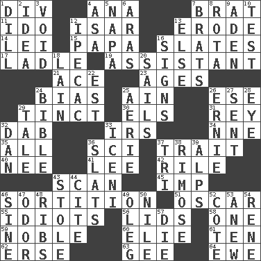ACROSS 1. HTML Container Element 4. Santa ___, CA 7. Naughty child 11. Wedding promise 12. Austrian river, tributary to the Danube 13. Eat (away) 14. Luau accessory 15. Dad 16. Chalkboards 17. Dipping utensil 19. Helper 21. Adept person 23. Eras 24. Prejudice 25. The 18th letter of the Arabic alphabet 26. Compass dir. 29. Colored lightly or faintly 30. Raised railways 31. Marina Del _, California 32. Small moist lump or mass 33. Big collection agency 34. Compass dir. 35. 100% 36. _-fi 37. Distinguishing feature 40. Born 41. Area sheltered from the wind 42. Cause heat under the collar 43. Examine hastily 45. Mischievous child 46. Casting lots 51. Witty Wilde 55. Foolish or stupid persons 56. Hats (slang) 58. Single 59. Impressive in appearance 60. Writer Wiesel 61. "___ Little Indians" 62. Celtic language 63. Turn to the right 64. She-sheep DOWN 1. Deli pickle 2. The main thing one is thinking about 3. Empty area or space 4. White ___ sheet 5. California wine valley 6. Ancient river in northeast Turkey 7. Naughty children 8. Roll call or roster of names 9. Arabian gulf 10. Trial 12. Medicinal drug used to evoke vomiting 13. Otherwise 16. Omens 18. (Had) reclined 20. Moves on water 22. Eastern Standard Time (abbr.) 24. The Good Book 25. Nest on high 26. Bert's buddy 27. Transmitted 28. Sight organ 29. Lie 32. One of the 12 tribes of Israel 33. Ancient Celtic tribe of eastern Britain 36. Narrow boards 37. Three (prefix) 38. Full of chinks, cracks, or crevices 39. High mountains 43. Took without asking 44. Quote 46. Trig term 47. Aroma 48. Teases 49. Cassini of fashion 50. "Death on the ____" 52. ____ d'Azur (French Riviera) 53. Afresh 54. French philosopher Descartes 57. Pass on