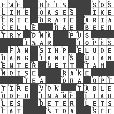 ACROSS 1. She-sheep 4. Antes 8. Distress signal 11. Welles in "The Third Man" 13. Fertile tracts in a desert 15. D.D.E's nickname 16. 4th largest of the Great Lakes 17. Speak pompously 18. Operatic vocal solo 19. Cell (Danish) 21. Actress Charlotte 22. Fermented drink made from hops 23. Attempt to accomplish something 24. Heredity factor (abbr.) 27. Festering 29. Austrian river, tributary to the Danube 30. Drinks excessively 34. Avid follower 36. Simple or foolish person 39. Dodge 40. Mild oath, euphamism for damn 41. Corrects by punishment or discipline 43. ____ Bator, Mongolia 44. Keyboard key 46. Remaining after all deductions 47. Scottish cap 48. Annoying sound 49. Immoral or dissolute person 51. Beverage made from leaves 53. Mouth or opening 54. Elect 57. Become fatigued 60. Solemn pledge 63. Eating place 65. Wrote a lyric poem 66. Silly 69. One who doesn't tell the truth 70. French article 71. Prevent from occurring 72. Allows 73. Erode 74. Portico 75. Perceive with the eye DOWN 1. Choose 2. One who wires 3. Poet Dickinson 4. Sometimes accompanies a hiss 5. Hearing organ 6. Russian ruler of old 7. Stalk of a moss capsule 8. Male parent of an animal 9. Migrant worker of the '30s 10. Shrivel 12. Snakelike fish 14. Ooze 18. Utter; complete 20. Begley and Asner 25. Political cartoonist Thomas 26. Believer in; advocate of (suffix) 28. Shoshoni 29. Consumed 31. Monetary unit of Botswana 32. Dutch treat 33. Elected rep. 34. Papal veil 35. Opposed to 37. Madame (abbr.) 38. Stone: prefix 40. Lair 42. Play the lead 45. To riddle 50. Krazy ___ of comics 52. Enthusiastic 54. Off-Broadway awards 55. Food holder 56. Laconic 57. Lacquered or enameled metalware 58. It may be bright or harebrained 59. Repose 61. Washington bills 62. Electrical Unit 64. 100% 67. Modern: prefix 68. Epoch