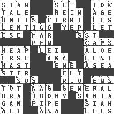 ACROSS 1. Comedian Laurel of Laurel & Hardy 5. Arrange properly for use 8. Pull behind 11. Story 12. It's straight from the horse's mouth 14. Ripen 15. Leaves out 17. High-altitude cloud 18. French article 19. Small, flat, pigmented spot on the skin 21. Slangy assent 22. Allow 23. Compass dir. 24. Make imperfect 25. Fast jet (abbr.) 27. Animal enclosure 28. Smile enhancers 31. Pile 35. Flowery wreath 37. _ vera 38. Celtic language 39. Alias (abbr.) 41. For fear that 42. Vertical spar for supporting sails 43. Compass dir. 45. Toward the sea 46. Disorderly outburst 47. Biblical high priest 49. Mayday 51. _ de Janeiro 52. Followers of ems 55. Small child 57. Tired old horse 60. Commissioned military rank 62. Mouth or opening 63. Literary sarcasm 65. Before Barbara or Clara 66. Separate the seeds from cotton 67. Corncob 68. Thailand, formerly 69. Keyboard modifier key 70. White ___ sheet 71. Snakelike fish DOWN 1. Fur scarf 2. Corrects by punishment or discipline 3. Place in a line 4. Remaining after all deductions 5. _ Lanka 6. Suggestive of the supernatural 7. Hoop that covers a wheel 8. Baron Munchausen's specialties 9. Double curve, resembling the letter S 10. Compass direction 13. Cuts off 16. Simple or foolish person 17. Pupil covering 20. Highlander 26. Any of the three canals of the cochlea 29. Airs 30. Bristle 31. Folds over and sews together 32. Part of Q.E.F. 33. Helper 34. Stone: prefix 36. Mamie's mate 40. Disorder of the immune system 44. Writer Wiesel 48. Charged atoms 50. Sever or remove by pinching or nipping 52. Bert's buddy 53. Relating to or accompanying birth 54. Hits or strikes with great force 55. Ancient Roman robe 56. Of the mouth 58. Operatic vocal solo 59. Republicans 61. Relaxation 64. Teachers' org.