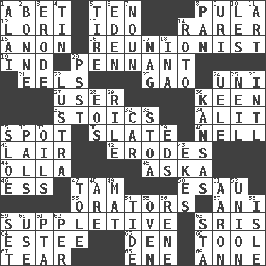 ACROSS 1. Collude with 5. "___ Little Indians" 8. Monetary unit of Botswana 12. Australian parrot (variant) 13. Wedding promise 14. Less widely known 15. At once, immediately (arch.) 16. One who advocates reunion 19. Working for oneself (abbr.) 20. Pre-World Series prize 21. Snakelike fish 23. E Mali city 24. Single; one (prefix) 27. One who makes use of a thing 30. Peachy ____! 31. Unemotional ones 34. Came down and settled, as after flight 35. Blemish 38. Schedule 40. 1994 drama film starring Jodie Foster 41. Den 42. Eats (away) 44. Rounded earthenware pot or jar 45. "____ silly question..." 46. Double-curved letter 47. Scottish cap 50. Son of Isaac 53. Speakers 57. Cuckoo 59. Supplementary 63. Indian titles of respect 64. First name in cosmetics 65. Lair 66. Instrument 67. Pull apart 68. Compass dir. 69. Queen of England 1702-14 DOWN 1. Jai _ 2. Child's nurse 3. Eat (away) 4. Metal container 5. Hoop that covers a wheel 6. Paradise 7. Part of speech 8. Baking dish 9. RI univ. 10. French article 11. Nonscientific branch of learning 14. Printing process, for short 17. Tired old horse 18. _ tizzy (2 wds.) 20. Inconspicuous attention getter 22. A period of five years 24. Ubangi River tributary 25. Famous astronaut Armstrong 26. International (abbr.) 28. Greek goddess of the dawn 29. Cause heat under the collar 30. Sunflower state 32. Auto 33. Portico 35. _ gin 36. Friends 37. Petroleums 39. Begley and Asner 43. Makes supply last 47. Lacquered or enameled metalware 48. "We ___ not amused" (Victoria) 49. Floor covering 51. Composer Copland 52. The state of being joined or united 54. Periodic rise and fall of the sea level 55. Baking chamber 56. French philosopher Descartes 58. Small island 59. Arrange properly for use 60. Purpose 61. Parent Teacher Assoc. 62. For each 63. R.R. building