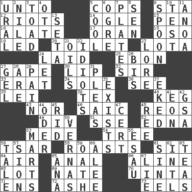 ACROSS 1. To (old English) 5. 911 reaches them 9. R.R. building 12. Disturbances 14. Stare 15. Writing instrument 16. Having winglike extensions 17. Northwest Algerian city 18. Bear (Spanish) 19. Directed 20. Bathroom 23. Globular water bottle used in Asia 24. Put down 25. Inky black, to poets 27. Yawn 30. Mouth edge 32. Title for a knight 33. Part of Q.E.F. 34. Flatfish 36. Observe 38. Flowery wreath 39. John Ritter's dad 40. Barrel 43. Not either 46. Ketch in the Levant 48. Vintage cars 49. HTML Container Element 51. Compass dir. 52. Pulitzer Prize-winning author Ferber 53. Ancient Persian 54. Relationship diagram 56. Russian ruler of old 58. Cooks with dry heat, as in an oven 61. Be seated 64. Wind 65. Of or related to the anus 66. Place in a line 68. Car dealer's back yard 69. Nathan's nickname 70. National forest in Provo, Utah 71. Followers of ems 72. American tennis player Robert 73. Snakelike fish DOWN 1. Mountain range 2. Mediterranean tributary 3. Frog relative 4. Baseball player Mel 5. Calm and collected 6. Legendary monster 7. Food holders 8. Elected rep. 9. Soup utensil 10. Trial 11. Small Philippine buffalo 13. Bristle 21. Lubricates 22. Foolish or stupid persons 23. Old wives' tales, e.g. 24. Allow 26. Altar cloth linen 27. Set 28. "We ___ not amused" (Victoria) 29. Ache 31. Entreaties 35. Is 37. Supplemented with great effort 41. Age 42. Girls' org. (abbr.) 44. Baltic tributary 45. To free from 47. Sure thing 48. To riddle 50. Actresses Bloom and Felton 53. Shops 55. Son of Isaac 56. Story 57. The Jewish people; Israel 59. Pledge 60. Toward shelter 61. Trig term 62. International (abbr.) 63. Beverages made from leaves 65. Santa ___, CA 67. Falsehood