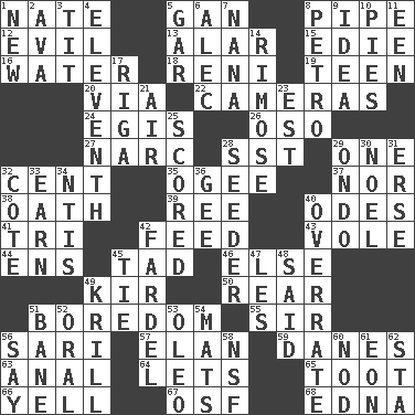 ACROSS 1. Nathan's nickname 5. Separate the seeds from cotton 8. Corncob 12. Morally bad or wrong 13. Having or resembling wings 15. Singer Brickell 16. Wetness 18. Painter Guido (1575-1642) 19. Adolescent 20. By way of 22. Devices for capturing images 24. Armor plate that protects the chest 26. Bear (Spanish) 27. Drug cop 28. Fast jet (abbr.) 29. Single 32. Penny 35. Double curve, resembling the letter S 37. And not 38. Pledge 39. To riddle 40. Lyric poems 41. Three (prefix) 42. Nourish 43. Grand slam 44. Followers of ems 45. Small boy 46. Otherwise 49. Apertif with cassis 50. Bring up, as a child 51. Mood resulting from idleness 55. Title for a knight 56. Indian skirt 57. Flair 59. Natives or inhabitants of Denmark 63. Of or related to the anus 64. Allows 65. A blast of a horn 66. Shout 67. Order of Saint Francis (abbr.) 68. Pulitzer Prize-winning author Ferber DOWN 1. ___ Haven, CT 2. Actress Gardner 3. Teat (slang) 4. Veterans Day date 5. Slender fish 6. Actor Baldwin 7. Nanny 8. Stone: prefix 9. The content of cognition 10. Sliced desserts 11. Car or cant ending 14. Full of chinks, cracks, or crevices 17. Capital of Latvia 21. Wind 23. Eastern Standard Time (abbr.) 25. Tallied 28. Sowing specialist 29. Southwest Nigerian state 30. Christmas carol 31. Celtic language 32. ____ d'Azur (French Riviera) 33. Merit 34. Nuclear Threat Initiatives 36. Unit of force equal to gravity 40. Make much ado about nothing 42. Pack 45. Neckwear 47. French article 48. Expressed in words 49. The principal food of baleen whales 51. Object of repulsion 52. Spoken 53. Butter sub 54. Floor protectors 56. Declare 58. Overdraft (abbr.) 60. Allow head to fall sleepily 61. Age 62. R.R. building