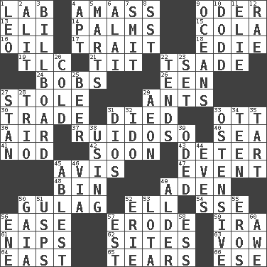ACROSS 1. Experiment locale 4. Collect or gather 9. River in Europe 13. Biblical high priest 14. Insides of hands 15. Root beer relative 16. Lubricate 17. Distinguishing feature 18. Singer Brickell 19. Affectionate concern, for short 21. Teat (slang) 22. Sadhe (variant) 24. Moves up and down 26. Car or cant ending 27. Took without asking 29. Pismires 30. Swap 31. Passed on 33. Baseball player Mel 36. Wind 37. Boisterous (Brazilian Portuguese) 40. Ocean 41. Lower and raise head in agreement 42. Within a short period 43. Prevent from occurring 45. Deliberation 47. Incident 48. Storage container 49. Arabian gulf 50. POW camp 52. Pipe bend 54. Compass dir. 56. Relaxation 57. Wear away 59. Lyricist Gershwin 61. Pinches, bites 62. Settings 63. Promise 64. Compass direction 65. Pulls into pieces 66. Compass dir. DOWN 1. Lion 2. Came down and settled, as after flight 3. Big road sign 4. Fitting 5. Shops 6. Mountain range southwest of Kyrgyzstan 7. Stricken, poetically 8. Fast jet (abbr.) 9. Seas 10. Texas town _ City 11. Writer Wiesel 12. Actress Charlotte 20. Having a low temperature 22. Is inclined (to) 23. Put into a specified state 25. Fermented drink made from hops 27. Comedian Laurel of Laurel & Hardy 28. Musical group of three 29. Age 31. "Vaya con ____" 32. Wedding promise 33. Clearly or manifestly demonstrative 34. Adolescent 35. Small pie 38. Putting into practice 39. Wrote a lyric poem 44. Nights before holidays 45. Most capable 46. By way of 49. Tree or shrub in the Birch family 50. Greek goddess of the earth (variant) 51. United States Postal Service (abbr.) 52. 4th largest of the Great Lakes 53. Globular water bottle used in Asia 55. Greek god of love 56. Compass dir. 57. Eastern Standard Time (abbr.) 58. Double-curved letter 60. Deep reverence