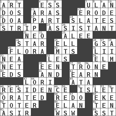 ACROSS 1. Nonscientific branch of learning 4. Curvy letter 7. ____ Bator, Mongolia 11. Two (Sp.) 12. Caspian sea tributary 13. Eat (away) 14. ___ good deed 15. Role in a play 16. Chalkboards 17. Long narrow piece of something 19. Helper 21. Modern: prefix 23. Toward shelter 24. Play the lead 25. Pipe bend 26. Girls' org. (abbr.) 29. Plants 30. Mountains (abbr.) 31. Cards in a Roman deck? 32. Teachers' org. 33. French article 34. Shade tree 35. Fish or hair follower 36. Car or cant ending 37. Heavy duty weighing machine 40. Begley and Asner 41. Also 42. Merit 43. Australian parrot (variant) 45. _ moment's notice (2 wds.) 46. Dwelling 51. Small island 55. Spoke pompously 56. Do over again 58. Supplement with great effort 59. Carrier 60. Liveliness 61. Nine, plus one 62. SW Saudi Arabia district 63. Compass dir. 64. Fast jet (abbr.) DOWN 1. Does sums 2. Carrot, for example 3. Russian ruler of old 4. Period 5. "Two Mules for Sister ____" 6. Fast planes 7. A salt of uric acid 8. Globular water bottle used in Asia 9. Arabian gulf 10. A home for chicks 12. Become visible 13. Otherwise 16. Beverly of Met fame 18. To the inside or interior of 20. Table seasonings 22. Mouth or opening 24. Narrow boards 25. Make improvements or corrections to 26. American astronaut and politician John 27. Drop; flow; fall 28. Direct toward a target or goal 29. Nourish 32. Compass dir. 33. Soviet premier 1918-24 36. Having ears or earlike features 37. Beverage made from leaves 38. Food allowance for one day 39. Mouths or openings 43. 61 cubic inches 44. River in Europe 46. Round or rotation of duties 47. Greek god of love 48. Suttee (variant) 49. Group working together 50. Snakelike fish 52. Allows 53. Makes supply last 54. Portable shelter 57. Fool