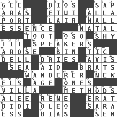ACROSS 1. Unit of force equal to gravity 4. "Vaya con ____" 8. Plant excrement 11. Caspian sea tributary 13. Needle case 14. Silent film actress Nazimova 15. Left side of a ship or aircraft 16. Den 17. Shopping center 18. Gist 21. Relating to or accompanying birth 22. A blast of a horn 23. Bear (Spanish) 25. Like a shrinking violet 26. Teat (slang) 29. Orators 32. Came up 34. Storage container 35. Nervous spasm 38. Small valley 39. Frees from moisture 41. Opinion 43. Ocean 44. Assist 45. Naughty children 46. Roamer 50. ___ Haven, CT 51. Raised railways 54. Grow older 55. Singles 57. Country residence 59. Modes 63. Toward shelter 64. French philosopher Descartes 67. Part of Q.E.F. 68. "You Light Up My Life" star Conn 69. Margarine 70. "Two Mules for Sister ____" 71. Curvy letter 72. Prejudice 73. Elected rep. DOWN 1. Yawn 2. Greek god of love 3. Hearing organs 4. Erase 5. Call ___ day 6. Fr. "Yes" 7. Title for a knight 8. Narrow boards 9. Assad's deity 10. Friendly 12. Proofreading order 14. Wet nurse (var.) 19. Olfactory organ 20. Police officer (slang) 21. And not 23. Migrant worker of the '30s 24. Elected reps. 26. Small amount or degree 27. Angers 28. Lacquered or enameled metalware 30. Tolerate 31. Play the lead 33. Cole _ (cabbage dish) 36. _ the terrible 37. Quote 39. Mild oath, euphamism for damn 40. Travel on or in a vehicle 42. Compass dir. 45. Cy Young winner Saberhagen 47. Auto club (abbr.) 48. Lover boys 49. Compass dir. 51. Elude 52. Ms. Damita and namesakes 53. Bobsleighs 56. "______ My Girl" (Turtles hit) 58. Flowery wreath 60. Mouths or openings 61. Have the gumption 62. Comedian Laurel of Laurel & Hardy 64. Director Reiner 65. Connecticut Ivy Leaguer 66. Teachers' org.
