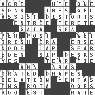 ACROSS 1. Measure of real estate 5. Shoshoni 8. Single 11. Neighbor of Neb. 12. Angers 13. Set 14. Aid 17. What propaganda does 19. Main course 21. Cigar-shaped 22. Greek goddess of the earth (variant) 23. Ocean 24. For each 27. Mail 29. Soggy 32. From or relating to Ireland 34. Period 36. Celtic language 37. Thickened enlargement 38. Pet locale 39. Scorch 40. Paradise 41. Small drink 42. Writing tables 43. Consenting reply 44. Pull into pieces 46. Neckwear 47. Housemaid (var.) 50. Ancient river in northeast Turkey 52. Spoke pompously 55. Window treatments 57. Accusation by an informer 59. Gossips 62. Followers of ems 63. Round or rotation of duties 64. I made a mistake 65. Friend of Pooh 66. Eastern Standard Time (abbr.) 67. Assign a rank or rating to DOWN 1. White ___ sheet 2. Music discs 3. Raze (variant) 4. Supplementing with great effort 5. RI univ. 6. Trials 7. First name in cosmetics 8. Legendary monster 9. Remaining after all deductions 10. Otherwise 12. Binary compound 15. Staphylococcus 16. Musical group of three 18. Mouth or opening 20. Artist's stands 24. Abounding in pines 25. Wear away 26. Amusement-park features 28. Distinguishing feature 29. Obtain by seizing forcibly or violently 30. 1973 Nobel Price Winner (Physics) Leo 31. Laconic 33. Elected rep. 35. Seem 36. Compass dir. 42. Window treatment 45. Like ___ of sunshine 47. _ moment's notice (2 wds.) 48. Distance measurement (Brit.) 49. Goodbye (Sp.) 51. Sir (Sp.) 52. Baltic tributary 53. Former U.S. Attorney General Janet 54. In addition 55. Heredity factor (abbr.) 56. Portico 58. Baseball player Mel 60. Fitting 61. Compass dir.