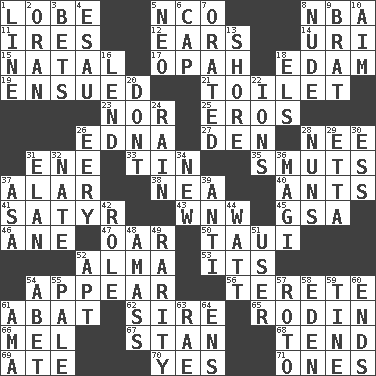 ACROSS 1. Ear part 5. Non-commissioned officer (abbr.) 8. Basketball assoc. 11. Angers 12. Hearing organs 14. RI univ. 15. Relating to or accompanying birth 17. Brightly colored fish 18. Dutch treat 19. Followed as a consequence or result 21. Rest room 23. Not either 25. Greek god of love 26. Pulitzer Prize-winning author Ferber 27. Lair 28. Born 31. Compass dir. 33. Shallow baking pan 35. Obscenities 37. Having or resembling wings 38. Teachers' org. 40. Pismires 41. Letch 43. Compass dir. 45. Girls' org. (abbr.) 46. One (Scot) 47. Rowing implement 50. "Change" in Tahitian 52. _ mater 53. It is 54. Become visible 56. Cigar-shaped 61. Blind as ____ 62. The founder of a family 65. "The Thinker" sculptor 66. Cartoonist voice _ Blanc 67. Comedian Laurel of Laurel & Hardy 68. Watch over 69. Had dinner 70. It is so 71. Washington bills DOWN 1. Actor's bit 2. NW Algerian seaport 3. Wagers 4. He sold his birthright 5. Modern: prefix 6. Head covering 7. Spoke pompously 8. Unadorned 9. Naughty child 10. Direct toward a target or goal 13. Dinah or Pauly 16. Grant temporary use of 18. Raised railways 20. Do not 22. Charged particles 24. Water falling in drops from the sky 26. Suggestive of the supernatural 28. Religious women 29. Singer James 30. Curvy letter 31. Flair 32. Nathan's nickname 34. ___ Haven, CT 36. Wise men 37. White ___ sheet 39. Opposed to 42. Hero or heavy, e.g. 44. Electrical Unit 48. Collect or gather 49. Noteworthy scarcity 51. One who makes use of a thing 52. Fitting 54. Collude with 55. Light colored 57. Printing process, for short 58. Genesis locale 59. Prong on a fork 60. Extremities 61. Housemaid (var.) 63. Actress Charlotte 64. Followers of ems