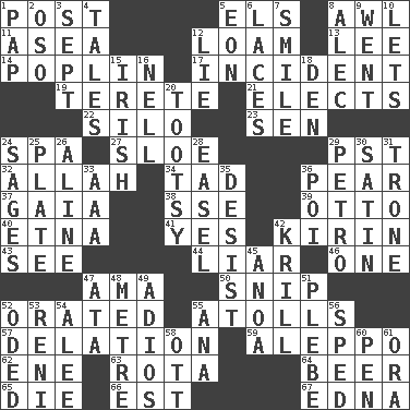 ACROSS 1. Mail 5. Raised railways 8. Leather borer 11. At sea 12. Rich soil 13. Area sheltered from the wind 14. Cotton for raincoats, e.g. 17. Event 19. Cylindrical with tapered ends 21. Opts 22. Grain storage tower 23. Elected rep. 24. Health resort 27. _ gin 29. Pacific Standard Time (abbr.) 32. Assad's deity 34. Small amount or degree 36. Lightbulb-shaped fruit 37. Greek goddess of the earth (variant) 38. Compass dir. 39. "Beetle Bailey" pooch 40. Inactive volcano in Sicily 41. Consenting reply 42. Japanese brewing company 43. Perceive with the eye 44. One who doesn't tell the truth 46. Single 47. Nanny (var.) 50. Sever or remove by pinching or nipping 52. Declaimed 55. Ringlike coral islands and reefs 57. Conveyance 59. City in Syria 62. Compass dir. 63. Round or rotation of duties 64. Fermented drink made from hops 65. Expire 66. Eastern Standard Time (abbr.) 67. Pulitzer Prize-winning author Ferber DOWN 1. Infant food 2. Bear (Spanish) 3. Back-to-school mo. 4. Stories 5. A really long time 6. Shoestrings 7. Grin 8. Actor Baldwin 9. Gone 10. Allows 12. Untruth 15. From or relating to Ireland 16. 1994 drama film starring Jodie Foster 18. Lair 20. Tootsie (variant) 24. Gurus 25. Food holder 26. Place in a line 28. Artist's stand 29. Stone: prefix 30. Smooth fabric 31. Heavy duty weighing machine 33. American Automobile Association (abbr.) 35. Cease 36. Luau course 42. Shrimp-like planktonic crustaceans 45. Small Philippine buffalo 47. _ moment's notice (2 wds.) 48. Distance measurement (Brit.) 49. Goodbye (Sp.) 51. Military trainee 52. Wrote a lyric poem 53. Painter Guido (1575-1642) 54. Toward shelter 55. Santa ___, CA 56. Hurried 58. Baseball player Mel 60. Writing instrument 61. Mouth or opening