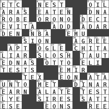 ACROSS 1. And so on (abbr.) 4. A home for chicks 8. Petroleum 11. Ancient river in northeast Turkey 13. Ingested 15. Heredity factor (abbr.) 16. Loose flowing garment 17. U. of Maine site 18. Tenth: prefix 19. Webber/Rice musical 21. Increase 22. The sixth month of the Jewish calendar 23. Lair 24. Basketball assoc. 27. Australian flightless bird 29. The Jewish people; Israel 30. Match 34. Fitting 36. Stare 39. Riviera of "Kiss of the Spider Woman" 40. One who doesn't tell the truth 41. Agitate, as a liquid 43. Drawn tight 44. Ferber et al. 46. "Beetle Bailey" pooch 47. Biblical high priest 48. Trials 49. Arab leader 51. John Ritter's dad 53. Period of immesurable duration 54. "One Day ___ Time" 57. To (old English) 60. Was introduced to 63. Middle Eastern gold or silver currency 65. Merit 66. Having winglike extensions 69. Trial 70. Potassium hydroxide 71. Founders of families 72. Suttee (variant) 73. Compass dir. 74. Immeasurably long periods of time 75. To riddle DOWN 1. Having ears or earlike features 2. Collection of objects 3. Small house or cottage 4. Modern: prefix 5. Hearing organ 6. Portico 7. Look after 8. Wrote a lyric poem 9. South American Indian 10. Den 12. Put into a specified state 14. Thickened enlargement 18. Female offspring 20. Black tropical American cuckoo 25. Expressions of contempt or scorn 26. White American of non-Hispanic descent 28. Apple computer (short form) 29. Ski resort town in Vermont 31. Monetary unit of Yemen 32. Needle case 33. Consume 34. Helper 35. Baking dishes 37. Car dealer's back yard 38. First name in cosmetics 40. Allow 42. Same (prefix) 45. Compass dir. 50. Working for oneself (abbr.) 52. Dec. holiday 54. Approach 55. Clothes sense 56. Nick name for Arthur 57. Ubangi River tributary 58. Negative votes 59. Relationship diagram 61. Writer Wiesel 62. Edible starchy tuberous root 64. ___ a Wonderful Life 67. "___ Little Indians" 68. Curvy letter