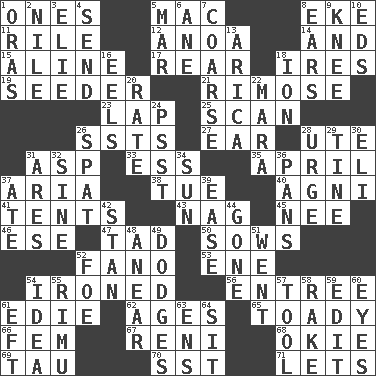 ACROSS 1. Washington bills 5. Apple computer (short form) 8. Make supply last 11. Cause heat under the collar 12. Small Philippine buffalo 14. Added to 15. Place in a line 17. Bring up, as a child 18. Angers 19. Sowing specialist 21. Full of chinks, cracks, or crevices 23. Infant locale 25. Skim 26. Fast planes 27. Hearing organ 28. Shoshoni 31. Cleo's killer 33. Double-curved letter 35. Showery time 37. Roberta Peters solo 38. Third day of the wk. 40. Hindu god of fire 41. Portable shelters 43. Tired old horse 45. Born 46. Compass dir. 47. Bit 50. Sty mamas 52. Papal veil 53. Compass dir. 54. Pressed 56. Main course 61. Singer Brickell 62. Ripens 65. Sycophant 66. Opposite of masc. 67. Painter Guido (1575-1642) 68. Migrant worker of the '30s 69. The 19th letter of the Greek alphabet 70. Fast jet (abbr.) 71. Allows DOWN 1. Mouths or openings 2. The longest river in the world 3. Writer Wiesel 4. Transmit 5. Impair 6. A saturated hydrocarbon 7. Rough 8. Hearing organs 9. Leg joint 10. Begley and Asner 13. N. Chile seaport 16. Snakelike fish 18. Electrically charged atom 20. Assign a rank or rating to 22. Hindu Mythology: god of death 24. Inconspicuous attention getter 26. Argument over a trivial matter 28. Goad 29. Prong on a fork 30. Connecticut Ivy Leaguer 31. Ancient Greek god of war 32. Trig term 34. Player for Phoenix 36. Baking dishes 37. Had dinner 39. Relaxation 42. Comedian Laurel of Laurel & Hardy 44. Went 48. Approach 49. Evades 51. Gone 52. Enemy 54. The main thing one is thinking about 55. Tall New Zealand timber tree 57. Utensil 58. Immoral or dissolute person 59. Prepare for publication 60. Snake ____ (dice throw) 61. Bank Draft (abbr.) 63. Followers of ems 64. Be seated