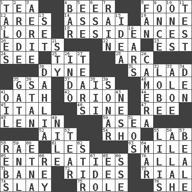 ACROSS 1. Afternoon social gathering 4. Fermented drink made from hops 8. 12 inches 12. Ancient Greek god of war 14. Slender Brazilian palm 16. Queen of England 1702-14 17. Old wives' tales, e.g. 18. Dwellings 20. Prepares for publication 22. Teachers' org. 23. Eastern Standard Time (abbr.) 24. Observe 25. Teat (slang) 28. Curve 30. Unit of force 31. Vegetable dish 35. Girls' org. (abbr.) 37. Raised platform 40. Undercover agent 41. Pledge 42. Constellation of myth 44. Inky black, to poets 45. Slanted text style (abbr.) 46. Trig term 47. To sift 48. Soviet premier 1918-24 50. Toward the sea 52. Small island 54. 17th letter of the Greek alphabet 55. Experiment locale 58. Actress Charlotte 61. French article 63. Grin 65. Pleas 70. Silent film actress Nazimova 71. Object of repulsion 72. Amusement-park features 73. Monetary unit of Yemen 74. Kill 75. Hero or heavy, e.g. 76. A female animal or person DOWN 1. Lies 2. Wear away 3. Nest on high 4. Soap unit 5. Compass dir. 6. Curvy letter 7. Water falling in drops from the sky 8. Avid follower 9. At one time in the past 10. Singles 11. Trial 13. Arrange properly for use 15. The main thing one is thinking about 19. Hearing organs 21. Filthy place 26. Southeast Asian peninsula 27. Pulls apart 29. Device for capturing images 30. Mexican or Central American flower 32. Ear part 33. Medicinal plant 34. Lair 35. Yard entry 36. Comedian Laurel of Laurel & Hardy 38. One more than two 39. Underwater navigation system 41. Petroleum 43. Soft 49. "Death on the ____" 51. Greek goddess of the dawn 53. Separate forcefully 55. Ms. Damita and namesakes 56. Assad's deity 57. Calif. Air Force Base 58. Confederate soldiers (slang) 59. Of or related to the anus 60. Inactive volcano in Sicily 62. Disorderly outburst 64. Impair 66. Marina Del _, California 67. Wedding promise 68. Snakelike fish 69. Compass dir.