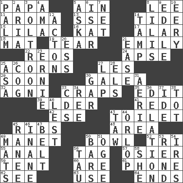 ACROSS 1. Dad 5. The 18th letter of the Arabic alphabet 8. Area sheltered from the wind 11. Scent 13. Compass dir. 14. Periodic rise and fall of the sea level 15. Pale purple color 16. Krazy ___ of comics 17. Having or resembling wings 18. Floor protector 19. Pull apart 21. Poet Dickinson 22. Vintage cars 24. Domed church section 25. Oak nuts 27. French article 29. Within a short period 30. An organ shaped like a helmet 32. Hindu god of fire 33. Dice game 35. Prepare for publication 39. A person who is older than you are 41. Make new 42. Compass dir. 43. Bathroom 45. Chest bones 48. Length times width 49. French painter Edouard 50. Soup holder 52. Three (prefix) 55. Of or related to the anus 56. Label 57. Flexible twig of a willow tree 59. Portable shelter 60. "We ___ not amused" (Victoria) 61. Give a jingle 62. Observe 63. Purpose 64. Extremities DOWN 1. Inside of hand 2. Operatic vocal solo 3. Coward 4. Nanny (var.) 5. "____ silly question..." 6. Austrian river, tributary to the Danube 7. Fish or hair follower 8. Ms. Damita and namesakes 9. Peak District village in England 10. Suggestive of the supernatural 12. 13-14th century defensive garment 14. Pack (down) 20. Curvy letter 21. Relaxation 23. Bert's buddy 25. White ___ sheet 26. Gear tooth 27. Pet locale 28. Raised railways 30. Slender fish 31. Nest on high 33. Music discs 34. To sift 36. Conveyance 37. Binary compound 38. Small child 40. For fear that 43. The 23rd letter of the Hebrew alphabet 44. Lowest deck of a ship 45. Indian princess (variant) 46. Silly 47. Waist strap 49. Floor protectors 50. Taverns 51. Double curve, resembling the letter S 53. Tear apart 54. Angers 56. The 19th letter of the Greek alphabet 58. A female animal or person