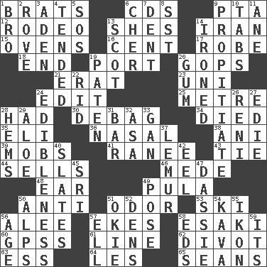 ACROSS 1. Naughty children 6. Music discs 9. Parent Teacher Assoc. 12. Cowboy competition 13. "______ My Girl" (Turtles hit) 14. SW Asia republic 15. Baking chambers 16. Penny 17. Loose flowing garment 18. Conclusion 19. Left side of a ship or aircraft 20. Republicans 21. Part of Q.E.F. 23. Single; one (prefix) 24. Prepare for publication 25. Distance measurement (Brit.) 28. Possessed 30. Debunk (Brit. slang) 34. Passed on 35. Connecticut Ivy Leaguer 36. Rhinal 38. Black tropical American cuckoo 39. Disorderly crowds 41. The wife of a rajah (variant) 43. Neckwear 44. Exchanges for money 46. Ancient Persian 48. Ewer handle 49. Monetary unit of Botswana 50. Opposed to 51. Scent 53. What Jean-Claude Killy likes to do 56. Toward shelter 57. Makes supply last 58. 1973 Nobel Price Winner (Physics) Leo 60. Global Positioning Systems (abbr.) 61. Actor's bit 62. A piece of turf (Scot.) 63. Double-curved letter 64. French article 65. Actors Connery and Penn DOWN 1. Sis' sibling 2. Be footloose 3. Arabian gulf 4. Watched over 5. Mayday 6. "Mermaids" star 7. Incision 8. Fast jet (abbr.) 9. Appease 10. Bar bills 11. A saturated hydrocarbon 13. Native of Scotland 14. Pressed 19. Eucharist need 20. Chewing product 22. To free from 24. The property of being fit to eat 26. Painter Guido (1575-1642) 27. Singer Brickell 28. Cloth borders 29. _ vera 31. Drinking establishment 32. White ___ sheet 33. Separate the seeds from cotton 37. Arboreal primate 40. Chalkboards 42. Snakelike fish 45. _ Lanka 47. Small ungulate mammals of Africa 49. Introduce or present, as a question 50. High mountains 51. Migrant worker of the '30s 52. Habitations of wild animals 54. Polynesian shrub of the pepper family 55. Image 56. Grow older 57. Pipe bend 58. Begley and Asner 59. ___ a Wonderful Life