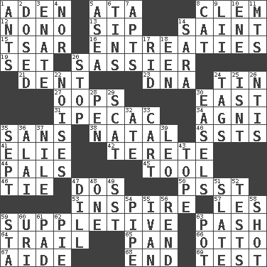 ACROSS 1. An important port of Yemen 5. "One Day ___ Time" 8. Clement's nick name 12. Words to Nanette 13. Small drink 14. Inhabitant of Heaven 15. Russian ruler of old 16. Pleas 19. Arrange properly for use 20. More impudent 21. Incision 23. Heredity factor (abbr.) 24. Metal container 27. I made a mistake 30. Compass direction 31. Medicinal drug used to evoke vomiting 34. Hindu god of fire 35. Without 38. Relating to or accompanying birth 40. Fast planes 41. Writer Wiesel 42. Cigar-shaped 44. Friends 45. Implement 46. Make a knot 47. Two (Sp.) 50. Inconspicuous attention getter 53. Motivate 57. French article 59. Supplying deficiencies 63. Romantic infatuation 64. Get behind 65. Baking dish 66. "Beetle Bailey" pooch 67. Assistant 68. Conclusion 69. Trial DOWN 1. Pismires 2. Administered medicine 3. Maternal 4. Not either 5. Toward the sea 6. Canisters 7. Flats, for short 8. Domesticated feline 9. Cards in a Roman deck? 10. Compass dir. 11. Mountains (abbr.) 14. "Two Mules for Sister ____" 17. To free from 18. Car or cant ending 20. Discontinue 22. Annoying sounds 24. Labels 25. Is not 26. Nuclear Threat Initiatives 28. Writing instrument 29. Jazz singing style 30. Artist's stands 32. Had dinner 33. Haul 35. Back-to-school mo. 36. Jai _ 37. The longest river in the world 39. Lion 43. Drink excessively 47. Deli pickle 48. Single 49. Fast jet (abbr.) 51. Schedule 52. Trials 54. Corncob 55. "Terrible" tsar 56. Tear apart 58. Attempt 59. R.R. building 60. RI univ. 61. Groovy apt. 62. Sliced dessert 63. Plant holder