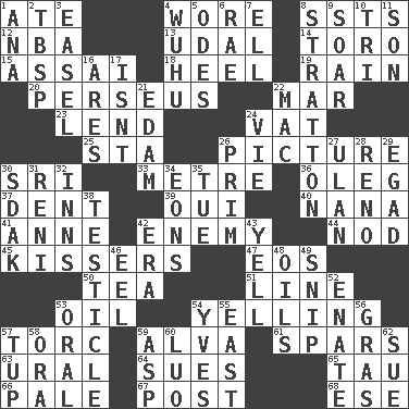 ACROSS 1. Had dinner 4. Had on 8. Fast planes 12. Basketball assoc. 13. Hereditary estate 14. "Corrida" creature 15. Slender Brazilian palm 18. The bottom of a shoe or boot 19. Precipitation 20. Son of Zeus who helped slay Medusa 22. Make imperfect 23. Grant temporary use of 24. Large container 25. R.R. building 26. Photo 30. Indian title of respect (Mr.) 33. Distance measurement (Brit.) 36. Cassini of fashion 37. Scratch 39. Fr. "Yes" 40. Nanny 41. Queen of England 1702-14 42. Foe 44. Dreamland 45. Smoochers 47. Greek goddess of the dawn 50. Beverage made from leaves 51. Actor's bit 53. Petroleum 54. Crying or shouting loudly 57. Torque (variant) 59. Inventor's middle name 61. Practice fights 63. Mountain range 64. Institutes legal proceedings 65. The 19th letter of the Greek alphabet 66. Diluted with white 67. Mail 68. Compass dir. DOWN 1. Santa ___, CA 2. Cook's measure (abbr.) 3. Artist's stand 4. Chinese city south-southwest of Nanjing 5. Lyric poems 6. Actress Charlotte 7. Pipe bend 8. Ski resort town in Vermont 9. Fly high 10. Three (prefix) 11. Boy, to dad 16. Ancient Greek god of war 17. Is not 21. Dutch treat 22. Apple computer (short form) 24. Compete 26. Demure 27. Uhlan (variant) 28. Western Nevada city 29. Mild oath 30. Neighbor of Neb. 31. Painter Guido (1575-1642) 32. Taverns 34. Immeasurably long periods of time 35. Third day of the wk. 38. One of the two male reproductive glands 42. Epoch 43. Shout 46. Snakelike fish 48. Petroleums 49. Clip 52. Related on the mother's side 53. Of the mouth 54. Jacques Cousteau's middle name 55. 90 degrees 56. Pate de foie ____ 57. Uncastrated adult male sheep 58. Mouth or opening 59. Viper 60. Nilotic language 62. Institute legal proceedings