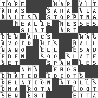 ACROSS 1. Drink excessively 5. Atlas unit 8. The first octave above the treble staff 11. Ancient river in northeast Turkey 12. "Two Mules for Sister ____" 13. By way of 14. Greek mezzo-soprano Agnes 17. Ceasing 19. Ear of corn 21. Makes clutter 22. Narrow board 23. Tate display 24. Lair 27. Curves 29. Tired old horse 32. Prevent the occurrence of 34. Part of HMS, perhaps 36. Shopping center 37. Billionth: prefix 38. Pipe bend 39. Son of Isaac 40. Paradise 41. "Barney Miller" actor Jack 42. Chalkboard 43. Put into a specified state 44. Connect, as a bridge 46. French article 47. Nursemaid (var.) 50. Greek god of love 52. Spoke pompously 55. Foolish or stupid persons 57. Conveyance 59. Ringlike coral islands and reefs 62. Heredity factor (abbr.) 63. Round or rotation of duties 64. Spoils 65. Elected rep. 66. Eastern Standard Time (abbr.) 67. Singer James DOWN 1. Keyboard key 2. Mouth or opening 3. Inside of hand 4. _____ Park, CO 5. Floor covering 6. Odor 7. Some stationery 8. Opinion 9. Actor's bit 10. Labels 12. Compass dir. 15. First course 16. Having or resembling wings 18. Pacific Standard Time (abbr.) 20. Skin irritations 24. Natives or inhabitants of Denmark 25. Dodge 26. Music written for nine 28. Grain storage towers 29. Rhinal 30. Having winglike extensions 31. Adhesives 33. Electrically charged atom 35. Inclined 36. Cartoonist voice _ Blanc 42. Snout, nose 45. Operatic vocal solo 47. _ moment's notice (2 wds.) 48. Distance measurement (Brit.) 49. Goodbye (Sp.) 51. Took without asking 52. Likelihood 53. French philosopher Descartes 54. ____ Jay Lerner 55. _ tizzy (2 wds.) 56. Notch 58. Baseball player Mel 60. Car dealer's back yard 61. R.R. building