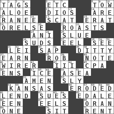 ACROSS 1. Labels 5. And so on (abbr.) 8. Pull behind 11. Medicinal plant 12. "Vaya con ____" 14. "We ___ not amused" (Victoria) 15. Indian princess (variant) 17. Get outta here! 18. Part of Q.E.F. 19. Threatening words 21. Exposes to great heat 23. Black tropical American cuckoo 25. Change direction abruptly 26. Beer foam 27. Snakelike fish 28. Perceive with the eye 31. Luau accessory 33. Plant excrement 35. Simple song 37. Merit 38. Director Reiner 40. Short letter 41. One who wires 43. One more than two 45. Numbers guy (abbr.) 46. Followers of ems 47. Frozen water 50. Toward the sea 52. So be it 53. Roguish 54. Sunflower state 56. Eaten away 61. Grant temporary use of 62. Institutes legal proceedings 65. Peak District village in England 66. Car or cant ending 67. Snakelike fish 68. Northwest Algerian city 69. Single 70. Be seated 71. Monthly bill DOWN 1. Edible starchy tuberous root 2. Having or resembling wings 3. Went 4. Sew up the eyelids of hawks and falcons 5. Begley and Asner 6. Nervous spasm 7. Rough 8. Small pie 9. Mouths or openings 10. Soggy 13. Took without asking 16. Son of Isaac 18. Compass dir. 20. Conclusions 22. Old (Scot.) 24. Austrian river, tributary to the Danube 26. Trig term 28. Cease 29. Singer James 30. Sight organ 31. (Had) reclined 32. Blunders 34. Luau course 36. South American Indian 37. She-sheep 39. Prejudice 42. Basketball hoops 44. Small island 48. Desist 49. Follows as a consequence or result 51. Jane of fiction 52. Added to 54. Peachy ____! 55. Singer Murray 57. Scent 58. Have the gumption 59. Enthusiasm 60. Scratch 61. Lion 63. Biblical high priest 64. Fast jet (abbr.)