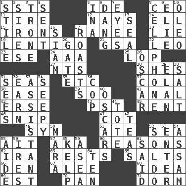 ACROSS 1. Fast planes 5. Binary compound 8. Corporate head (abbr.) 11. Become fatigued 12. Negative votes 14. Pipe bend 15. Metal shackles 17. The wife of a rajah (variant) 18. Untruth 19. Small, flat, pigmented spot on the skin 21. Girls' org. (abbr.) 22. Lion 23. Compass dir. 24. Auto club (abbr.) 25. Trim (branches) 27. Mountains (abbr.) 28. "______ My Girl" (Turtles hit) 31. Oceans 35. And so on (abbr.) 37. Root beer relative 38. Relaxation 39. "Barney Miller" actor Jack 41. Of or related to the anus 42. Celtic language 43. Pacific Standard Time (abbr.) 45. Monthly bill 46. Clip 47. Small bed 49. Symbol (abbr.) 51. Had dinner 52. Ocean 55. Small island 57. Alias (abbr.) 60. Thinks logically 62. Lyricist Gershwin 63. Musical pauses 65. Table seasonings 66. Lair 67. Toward shelter 68. The content of cognition 69. Eastern Standard Time (abbr.) 70. Baking dish 71. Dormintory (informal) DOWN 1. Vertical member of a panel or frame 2. Founders of families 3. Marketplace scale 4. Posted 5. _ tizzy (2 wds.) 6. Mild oath, euphamism for damn 7. Snake ____ (dice throw) 8. Portable communications device 9. Writer Wiesel 10. Butter sub 13. Lick closed 16. Thailand, formerly 17. Exposes to great heat 20. Yard entry 26. Motion picture award 29. Flair 30. Table seasoning 31. Perceives with the eye 32. Merit 33. Helper 34. Not well drained, as in land 36. Police officer (slang) 40. Motion picture awards 44. Carryall 48. Afternoon social gatherings 50. Hindu Mythology: god of death 52. Twentieth part of a lira 53. Keyboard key 54. Indian state 55. Helper 56. Angers 58. Seaweed 59. At sea 61. Alleged 64. "___ Little Indians"