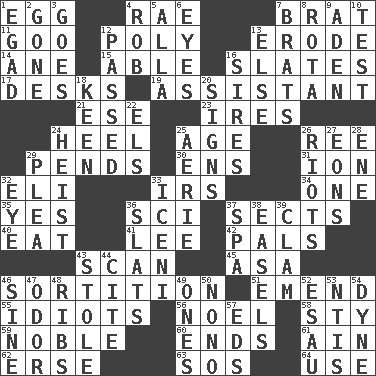 ACROSS 1. Ovum 4. Actress Charlotte 7. Naughty child 11. Thick or sticky substance 12. More than one (prefix) 13. Wear away 14. A saturated hydrocarbon 15. Competent 16. Chalkboards 17. Writing tables 19. Aide 21. Compass dir. 23. Angers 24. The bottom of a shoe or boot 25. Grow older 26. Portuguese money of account (variant) 29. Hangs 30. Followers of ems 31. Electrically charged atom 32. Biblical high priest 33. Big collection agency 34. Single 35. Affirmative reply 36. _-fi 37. Religious groups 40. Consume 41. Area sheltered from the wind 42. Friends 43. Skim 45. White ___ sheet 46. Drawing lots 51. Make improvements or corrections to 55. Foolish or stupid persons 56. Christmas carol 58. Filthy place 59. Having high moral qualities 60. Conclusions 61. The 18th letter of the Arabic alphabet 62. Celtic language 63. Mayday 64. Purpose DOWN 1. Mild oath 2. Went 3. Leaves 4. Director Reiner 5. Silent film actress Nazimova 6. Sight organs 7. Naughty children 8. Roll call or roster of names 9. Arabian gulf 10. Trial 12. Went by 13. Otherwise 16. Begets 18. Peachy ____! 20. Signals 22. Raised railways 24. Robbery 25. Nest on high 26. Debaucheries 27. Immeasurably long periods of time 28. Compass dir. 29. Entreaty 32. Sight organ 33. Ancient Celtic tribe of eastern Britain 36. Narrow boards 37. Health resort 38. Artist's stands 39. Dollar (slang) 43. Fur scarf 44. Quote 46. Trig term 47. Aroma 48. Teases 49. Singles 50. Words to Nanette 52. Son of Isaac 53. Nuclear Threat Initiatives 54. Centimeter-gram-second unit of force 57. Begley and Asner