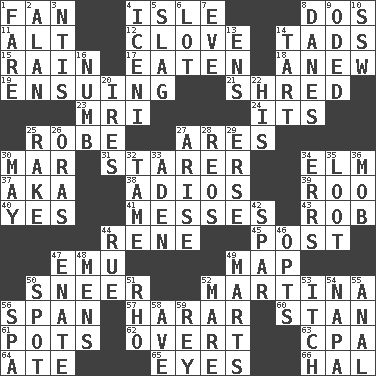 ACROSS 1. Air blower 4. Capri or Wright 8. Two (Sp.) 11. The first octave above the treble staff 12. Garlic unit 14. Small amounts or degrees 15. Precipitation 17. Eroded 18. Afresh 19. Taking place subsequently 21. Fragment 23. Medical imaging device (abbr.) 24. It is 25. Loose flowing garment 27. Ancient Greek god of war 30. Third mo. 31. A viewer who gazes fixedly 34. Shade tree 37. Alias (abbr.) 38. Goodbye (Sp.) 39. Friend of Pooh 40. Affirmative reply 41. Makes clutter 43. Director Reiner 44. French philosopher Descartes 45. Mail 47. Australian flightless bird 49. Atlas unit 50. Scornful expression 52. Chrissie's court nemesis 56. Connect, as a bridge 57. Ethiopian city, capital of Harari 60. Comedian Laurel of Laurel & Hardy 61. Plant holders 62. Unconcealed 63. Accounting whiz (abbr.) 64. Had dinner 65. Sight organs 66. Actor Linden DOWN 1. Conductor's collection 2. Actor Alda or Thicke 3. Nuclear Threat Initiatives 4. Ancient Celtic tribe of eastern Britain 5. Volcanic refuse 6. Car dealer's back yard 7. Night before a holiday 8. Natives or inhabitants of Denmark 9. Wrote a lyric poem 10. Compass dir. 13. Followers of ems 14. Small pie 16. Unfeeling 20. Angers 22. Part of HMS, perhaps 25. Libertine 26. Mouths or openings 27. Originate 28. Vintage cars 29. Celtic language 30. Can I? 32. Docile 33. Arabian gulf 34. Blunders 35. Plunder 36. Disorderly crowd 42. Coast Guard woman 44. Regret 46. Chooses 47. Maternal 48. Not women's 49. Shops 50. Blemish 51. 17th letter of the Greek alphabet 52. Female horse 53. Hankering 54. California wine valley 55. Of or related to the anus 56. Health resort 58. "___ Maria" 59. Marina Del _, California