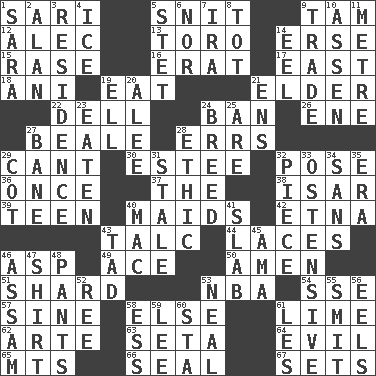 ACROSS 1. Indian skirt 5. In a ____ (agitated or irritated) 9. Scottish cap 12. Actor Baldwin 13. "Corrida" creature 14. Celtic language 15. Raze (variant) 16. Part of Q.E.F. 17. Compass direction 18. Cuckoo 19. Ingest 21. A person who is older than you are 22. Small valley 24. Prohibit 26. Compass dir. 27. Memphis, Tenn. Street 28. Blunders 29. Patter 30. First name in cosmetics 32. Airs 36. Single time 37. Definite Article 38. Austrian river, tributary to the Danube 39. Adolescent 40. Women servants 42. Inactive volcano in Sicily 43. Baby powder 44. Shoestrings 46. Viper 49. Adept person 50. So be it 51. Broken piece 53. Basketball assoc. 54. Compass dir. 57. Trig term 58. Otherwise 61. Welles in "The Third Man" 62. Johnson of "Laugh-In" 63. Stalk of a moss capsule 64. Tending to cause great harm 65. Mountains (abbr.) 66. Lick closed 67. Puts into a specified state DOWN 1. "Two Mules for Sister ____" 2. Actor Alda or Thicke 3. Dwelling 4. Frozen water 5. Proofreading order 6. Or not 7. Retirement account (abbr.) 8. Small child 9. Buy and sell 10. NE Netherlands city 11. Distance measurement (Brit.) 14. Snakelike fish 19. Pipe bend 20. Toward shelter 21. Followers of ems 23. Eroded 24. A special lineage 25. "We ___ not amused" (Victoria) 27. Object of repulsion 28. Moral principle 29. Small bed 31. Having lost freshness 32. Component 33. Clearly or manifestly demonstrative 34. Without 35. Period 40. Big _ 41. Thick slice 43. Small amount or degree 45. Wet nurse (var.) 46. Indian state 47. Chest covering 48. Leg coverings 52. To riddle 53. Be tempered by heat 55. Stricken, poetically 56. Snakelike fish 58. Curvy letter 59. Area sheltered from the wind 60. R.R. building 61. French article