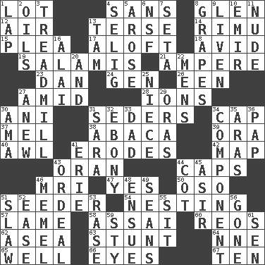 ACROSS 1. Car dealer's back yard 4. Without 8. Small, secluded valley 12. Atmosphere 13. Laconic 14. Tall New Zealand timber tree 15. Entreaty 17. At or to great height 18. Enthusiastic 19. Deli grouping 21. Electrical Unit 23. One of the 12 tribes of Israel 24. Commissioned military rank (abbr.) 26. Car or cant ending 27. Among 28. Charged particles 30. Cuckoo 31. Spring feasts 34. Head covering 37. Cartoonist voice _ Blanc 38. Phillipine bananalike plant 39. Mouth or opening 40. Leather borer 41. Eats (away) 42. Atlas unit 43. NW Algerian seaport 44. Balmoral and tarboosh 46. Medical imaging device (abbr.) 47. Consenting reply 50. Bear (Spanish) 51. Sowing specialist 54. Snuggling 57. Unable to walk 58. Slender Brazilian palm 60. Vintage cars 62. At sea 63. Check the growth or development of 64. Compass dir. 65. Not ill 66. Snake ____ (dice throw) 67. Nine, plus one DOWN 1. Pet locale 2. Lubricates 3. Excercise machine 4. Major League Baseball Commissioner Bud 5. Came up 6. Overdraft (abbr.) 7. Bristle 8. Wine fruits 9. Make or become more lively 10. Arab leader 11. Unadorned 13. Scottish cap 16. Mountain range southwest of Kyrgyzstan 20. Added to 22. Not women's 25. Sibling's daughter 27. Afresh 29. Mouths or openings 30. Housemaid (var.) 31. "Two Mules for Sister ____" 32. Black 33. Male parent 34. Part 35. Caspian sea tributary 36. Infant food 41. One of the Great Lakes 43. Severe or trying experience 44. Small bed 45. SW Saudi Arabia district 46. Klaipeda city 48. Follow as a consequence or result 49. Seines 51. Cole _ (cabbage dish) 52. Relaxation 53. Raze (variant) 55. Be seated 56. Went 59. Filthy place 61. Elected rep.