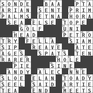 ACROSS 1. Message 6. Sound made by sheep 9. Parent Teacher Assoc. 12. Believer in; advocate of (suffix) 13. Emitted 14. Demure 15. Insides of hands 16. Inactive volcano in Sicily 17. Israeli folk dance 18. Ocean 19. Otherwise 20. Drink excessively 21. Eighteen holes 23. Corn or form start 24. Froth on beer 25. Stone: prefix 28. Attempt to accomplish something 30. Man or boy (slang) 34. Thailand, formerly 35. Small drink 36. Break or tear apart 38. Had dinner 39. Ripens 41. Arguments over trivial matters 43. Nine, plus one 44. More uncommon 46. Hollow 48. Sliced dessert 49. Trig term 50. Actor Griffith 51. Actor Baldwin 53. Compass dir. 56. _ gin 57. Liveliness 58. Sycophant 60. Stitch closed the eyes of (a falcon) 61. Alleged 62. Nick name for Arthur 63. Afternoon social gathering 64. Conclude 65. Confronts DOWN 1. Plant excrement 2. Mouths or openings 3. "Death on the ____" 4. Break 5. Followers of ems 6. Wagers 7. Singer Murray 8. "One Day ___ Time" 9. Conciliate 10. Hoop that covers a wheel 11. Nanny (var.) 13. Oneself 14. Gives a jingle 19. A person who is older than you are 20. Uncastrated adult male sheep 22. Clumsy lout 24. Abnormally rapid or deep breathing 26. Pace 27. Presage 28. Russian ruler of old 29. Port city in Latvia 31. French article 32. Pet locale 33. Actress Gardner 37. Value system 40. A glass for beer 42. Manchild 45. Marina Del _, California 47. Poe poem 49. Post 50. Toward shelter 51. ____ Jay Lerner 52. Put down 54. Nathan's nickname 55. Prepare for publication 56. Fast jet (abbr.) 57. Compass dir. 58. Scottish cap 59. Affirmative reply