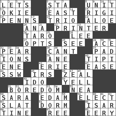 ACROSS 1. Allows 5. R.R. building 8. A single undivided whole 12. Migrant worker of the '30s 13. Compass direction 15. Swiss mountan, "Queen of the Mountains" 16. Actor Sean's family 18. Musical group of three 19. _ vera 20. Santa ___, CA 22. Hard copy producer 24. Pacific island yam 26. Area sheltered from the wind 27. Elects 28. Perceive with the eye 29. Adept person 32. Lightbulb-shaped fruit 35. Patter 37. Groovy apt. 38. Charged particles 39. A saturated hydrocarbon 40. Native american tent (variation) 41. Compass dir. 42. 4th largest of the Great Lakes 43. Comfort 44. Compass dir. 45. Big collection agency 46. Ardor 49. Wedding promise 50. Shout 51. Mood resulting from idleness 55. Teachers' org. 56. "Two Mules for Sister ____" 57. Dutch treat 59. Choose 63. Narrow board 64. Dormintory (informal) 65. Austrian river, tributary to the Danube 66. Prong on a fork 67. To riddle 68. Suggestive of the supernatural DOWN 1. Trim (branches) 2. Supplement with great effort 3. Shallow baking pan 4. Legislators 5. Arrange properly for use 6. Canvas cover 7. SW Saudi Arabia district 8. A salt of uric acid 9. "Death on the ____" 10. Composer Stravinsky 11. Neckwear 14. Bathroom 17. Fastener 21. Tate display 23. Born 25. Motion picture awards 28. Dwarf with a sinus problem 29. Capital of Western Samoa 30. Balmoral and tarboosh 31. Singer Brickell 32. Sliced desserts 33. Immeasurably long periods of time 34. Afresh 36. Black tropical American cuckoo 40. Copy Pinocchio 42. Worn away 45. Binary compound 47. Car or cant ending 48. Toward shelter 49. Feeling or showing extreme anger 51. Indonesian resort city 52. NW Algerian seaport 53. Scent 54. Female horse 56. Fast jet (abbr.) 58. Madame (abbr.) 60. Compass dir. 61. Auto 62. Attempt