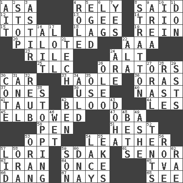 ACROSS 1. White ___ sheet 4. Depend 8. Expressed in words 12. It is 13. Double curve, resembling the letter S 14. Musical group of three 15. Add up to 18. Straggles 19. It's straight from the horse's mouth 20. Manned the helm 22. Auto club (abbr.) 23. Cause heat under the collar 24. Keyboard modifier key 25. Affectionate concern, for short 26. Speakers 30. Automobile 33. White Person, in Hawaii 36. Mouths or openings 37. Singles 39. Purpose 40. Political cartoonist Thomas 41. Pulled tight 42. Vital fluid 44. French article 45. Turned at an angle; bent 47. Chief or king in Benin or Nigeria 50. Writing instrument 51. Behest 53. Elect 54. Cordwainer's material 57. Australian parrot (variant) 59. Neighbor of Neb. 61. Sir (Sp.) 63. SW Asia republic 64. Single time 65. Federal power corp. 66. Mild oath, euphamism for damn 67. Negative votes 68. Observe DOWN 1. Small island 2. Constrict 3. Having gotten out of bed 4. Hero or heavy, e.g. 5. Mild oath 6. Part of a journey 7. Consenting reply 8. Ski resort town in Vermont 9. Type of rug 10. One more than two 11. Spanish title 16. Came down and settled, as after flight 17. Hang loosely or laxly 21. Technician 22. In the manner of 24. "We ___ not amused" (Victoria) 26. Butter sub 27. Of the mouth 28. To erase 29. Fast planes 30. ____ d'Azur (French Riviera) 31. Of or related to the anus 32. Reuben's nickname 34. Old (Scot.) 35. Bear (Spanish) 38. Discontinuing 42. Benjamin's nick name 43. Capital of the state of Qatar 46. Soggy 48. Stakes 49. American tennis player Robert 52. Portable shelters 53. NW Algerian seaport 54. Made of lace 55. Supplements with great effort 56. Be footloose 57. Hat (slang) 58. Mouth or opening 59. Boy, to dad 60. Heredity factor (abbr.) 62. Actress Charlotte