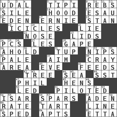 ACROSS 1. Allodial 5. Native american tent (variation) 9. Confederate soldiers (slang) 13. Drop; flow; fall 14. Parka part 15. He sold his birthright 16. Paradise 17. Bert's buddy 18. Comedian Laurel of Laurel & Hardy 19. Winter's stalactites 21. Falsehood 22. Olfactory organ 23. Hats (slang) 24. Personal Computers (abbr.) 27. French article 28. Open wide 29. Hold, grip (Informal) 31. Uncastrated adult male sheep 32. Pinches, bites 36. Light colored 37. Direct toward a target or goal 38. Supercomputer manufacturer 39. Type of rug 40. Night before a holiday 41. Eats 42. Family _ (genealogy) 44. Ocean 46. Fast jet (abbr.) 47. Silvers or Donahue 48. Coop moms 50. Directed 51. Manned the helm 54. Austrian river, tributary to the Danube 56. Practice fights 58. An important port of Yemen 60. Assign a rank or rating to 61. Small pie 62. Actor's bit 63. Drove too fast 64. Flats, for short 65. Singer James DOWN 1. Purpose 2. "You Light Up My Life" star Conn 3. Actor Baldwin 4. Soviet premier 1918-24 5. Threesomes 6. Charged particles 7. Luau course 8. Binary compound 9. Dwelling 10. _____ Park, CO 11. Sound made by sheep 12. Player for Phoenix 17. Otherwise 20. Chilled 21. Mouth edge 23. Pet locale 24. Dad 25. Burn to charcoal 26. Not divided or shared with others 28. Chewing product 30. Resembling or made to resemble leather 31. Neckwear 33. Angers 34. Writing tablets 35. System (abbr.) 37. "___ Maria" 40. Snakelike fish 41. Papal veil 43. To free from 44. Upper-body garments 45. Snakelike fish 47. Food holder 49. Lacking originality or spontaneity 51. Piece 52. Prepare for publication 53. Incision 54. Big collection agency 55. Plant excrement 56. R.R. building 57. Infant food 59. Teachers' org.