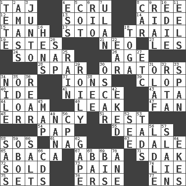 ACROSS 1. _ Mahal 4. Shade of tan 8. Algonquian 12. Australian flightless bird 13. Earth 14. Assistant 15. Hyperbolic tangent 17. Portico 18. Hang back 19. _____ Park, CO 21. Modern: prefix 23. French article 24. Underwater navigation system 26. Grow older 28. Practice fight 30. Speakers 34. And not 37. Charged particles 39. Hoof sound 40. Binary compound 41. Sibling's daughter 43. _ moment's notice (2 wds.) 44. Rich soil 46. Path through which fluid escapes 47. Avid follower 48. Tendancy to err 51. Respite 54. Infant food 55. Allots cards 58. Mayday 61. Tired old horse 63. Peak District village in England 65. Phillipine bananalike plant 67. Swedish rock group 71. Neighbor of Neb. 72. Exchanged or delivered for money 73. Ache 74. Untruth 75. Puts into a specified state 76. Celtic language 77. Followers of ems DOWN 1. Wig 2. Collect or gather 3. Secret group 4. Double-curved letter 5. Small bed 6. _ de Janeiro 7. Uhlan (variant) 8. Auto 9. Monetary unit of Yemen 10. Singer Brickell 11. Snakelike fish 16. Coop moms 18. Ancient Roman robe 20. Plant excrement 22. Hearing organ 25. Precipitation 27. And so on (abbr.) 29. Turbulent 30. Motion picture award 31. Norwegian king 32. Roll call or roster of names 33. Connect, as a bridge 34. The longest river in the world 35. Aroma 36. Bring up, as a child 38. Born 42. Supplemented with great effort 45. Atlas unit 49. Grandmother 50. Tax preparer (abbr.) 52. Perceive with the eye 53. Bits 56. Dipping utensil 57. Killed 58. Backtalk 59. Mitch Miller's instrument 60. Table seasoning 62. Open wide 64. Supplements with great effort 66. Music discs 68. Long, evenly shaped piece 69. Twice 70. One (Scot)