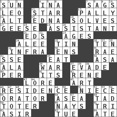 ACROSS 1. Player for Phoenix 4. _ tizzy (2 wds.) 7. Droops 11. Lion 12. Play the lead 13. Friendly 14. Keyboard modifier key 15. Pulitzer Prize-winning author Ferber 16. Finds the solution 17. Honkers 19. Aide 21. Begley and Asner 23. Grows older 24. Toward shelter 25. Shallow baking pan 26. Nine, plus one 29. Kind of red light 30. Followers of ems 31. Actress Charlotte 32. Compass dir. 33. Erode 34. White ___ sheet 35. Chicken ___ king 36. Armed conflict 37. Elude 40. For each 41. It is 42. French philosopher Descartes 43. Old wives' tales, e.g. 45. Nonscientific branch of learning 46. Dwelling 51. Sibling's daughter 55. Speaker 56. At sea 58. Small amount or degree 59. Carrier 60. Negative votes 61. Three (prefix) 62. SW Saudi Arabia district 63. Third day of the wk. 64. Had dinner DOWN 1. Volcanic refuse 2. Ubangi River tributary 3. Observe 4. It would 5. Grandmother 6. Ancient river in northeast Turkey 7. Table seasonings 8. Inventor's middle name 9. Small, secluded valley 10. System (abbr.) 12. Sowing specialist 13. Airs 16. Public displays of written messages 18. Oneself 20. Inhabitant of Heaven 22. Ocean 24. Approach 25. Rends 26. Exchange 27. Comfort 28. Teachers' org. 29. Small island 32. Plant excrement 33. Consumed 36. One who wires 37. Period 38. Actresses Bloom and Felton 39. Opposed to 43. 61 cubic inches 44. Scent 46. Roll call or roster of names 47. Greek god of love 48. Suttee (variant) 49. Patter 50. He sold his birthright 52. Singer James 53. Heavy open wagon 54. Singer Brickell 57. Sight organ