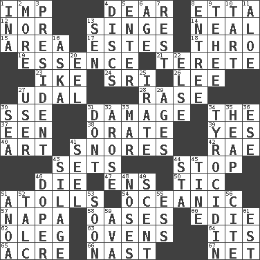 ACROSS 1. Mischievous child 4. Letter starter 8. Singer James 12. Not either 13. Scorch 14. Actress Patricia 15. Type of rug 17. _____ Park, CO 18. Through, poetically 19. Center 21. Cigar-shaped 23. Mamie's mate 24. _ Lanka 26. Area sheltered from the wind 27. Freehold land 28. Raze (variant) 30. Compass dir. 31. Break 34. Definite Article 37. Car or cant ending 38. Speak pompously 39. Affirmative reply 40. Nonscientific branch of learning 41. Sounds asleep 42. Actress Charlotte 43. Arranges properly for use 44. Discontinue 46. Pass on 47. Followers of ems 50. Nervous spasm 51. Ringlike coral islands and reefs 54. Pertaining to the sea 57. California wine valley 58. Fertile tracts in a desert 60. Singer Brickell 62. Cassini of fashion 63. Baking chambers 64. ___ a Wonderful Life 65. Measure of real estate 66. Political cartoonist Thomas 67. Fish or hair follower DOWN 1. _ tizzy (2 wds.) 2. Greater amount 3. Elected leader of a country 4. Flat circles 5. Keyboard key 6. Grow older 7. Relief 8. Main course 9. Giggle 10. Small pie 11. Medicinal plant 13. Elected rep. 16. "____ silly question..." 20. Snakelike fish 22. Otherwise 25. Feeling or showing extreme anger 27. One who uses or employs something 29. Matures 30. Ocean 31. Do not 32. Came up 33. Spoil 34. Polypeptide antibiotic 35. Pile 36. Compass dir. 41. Sew up the eyelids of hawks and falcons 43. Fodder prepared in a silo 44. R.R. building 45. Prong on a fork 46. Drug addict 48. Olfactory organs 49. Odor 51. Small Philippine buffalo 52. Baby powder 53. Within a short period 55. Double-curved letter 56. Quote 59. Actress Gardner 61. Eastern Standard Time (abbr.)