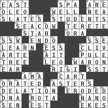 ACROSS 1. Compass direction 5. Health resort 8. A saturated hydrocarbon 11. Butter sub 12. Water source 13. Teachers' org. 14. Chalkboards 17. SAT takers 19. Manatee 21. Cylindrical with tapered ends 22. Play the lead 23. Mouth or opening 24. Compass dir. 27. Inside; within (prefix) 29. Compass dir. 32. Memorize 34. Curvy letter 36. 154 in Roman numerals 37. Johnson of "Laugh-In" 38. Small island 39. Whine 40. Family _ (genealogy) 41. Lion 42. Make _____ (do battle with) 43. Ewer handle 44. Swiss mountan, "Queen of the Mountains" 46. Fast jet (abbr.) 47. Nursemaid (var.) 50. Heavy open wagon 52. Declaimed 55. Michaelmas daisies 57. Accusation by an informer 59. Worn away 62. Heredity factor (abbr.) 63. Round or rotation of duties 64. Billionth: prefix 65. Elected rep. 66. Eastern Standard Time (abbr.) 67. Makes supply last DOWN 1. Greek goddess of the dawn 2. 100% 3. Oceans 4. Lugs 5. Put into a specified state 6. Cartoon dog 7. Tree or shrub in the Birch family 8. Singer Murray 9. Remaining after all deductions 10. Relaxation 12. Compass dir. 15. Eroded 16. Examine hastily 18. Period 20. Severe or trying experience 24. Chalkboard 25. Father Junipero _ 26. Wetness 28. Flexible twig of a willow tree 29. Disparaging remarks 30. Grain storage towers 31. Incident 33. To separate or throw off 35. Unemotional ones 36. Accounting whiz (abbr.) 42. One who wires 45. Yard entry 47. _ moment's notice (2 wds.) 48. Distance measurement (Brit.) 49. Goodbye (Sp.) 51. Heavy duty weighing machine 52. Likelihood 53. French philosopher Descartes 54. Actor Alda or Thicke 55. Santa ___, CA 56. Neighbor of Neb. 58. Baseball player Mel 60. Compass dir. 61. Two (Sp.)