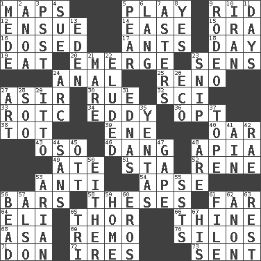 ACROSS 1. Atlas contents 5. Romp 9. To free from 12. Follow as a consequence or result 14. Comfort 15. Mouth or opening 16. Administered medicine 17. Pismires 18. 24 hours 19. Ingest 20. Develop 23. Elected reps. 24. Of or related to the anus 25. Western Nevada city 27. SW Saudi Arabia district 30. Sorrow 32. _-fi 33. College mil. group 34. Whirlpool 36. Choose 38. Small child 39. Compass dir. 40. Rowing implement 43. Bear (Spanish) 46. Mild oath, euphamism for damn 48. Capital of Western Samoa 49. Had dinner 51. R.R. building 52. French philosopher Descartes 53. Opposed to 54. Domed church section 56. Long, evenly shaped pieces 58. College papers 61. Distant 64. Biblical high priest 65. Son of Odin 66. One or ones belonging to thee 68. White ___ sheet 69. San ____ (Riviera town) 70. Grain storage towers 71. Spanish title 72. Angers 73. Posted DOWN 1. Ancient Persian 2. Small Philippine buffalo 3. Inconspicuous attention getter 4. Take to court 5. Lightbulb-shaped fruit 6. Long (Scottish) 7. Michaelmas daisies 8. Consenting reply 9. Cowboy competition 10. SW Asia republic 11. 24-hour periods 13. Locale of original sin 21. Female horse 22. Evaded 23. Sever or remove by pinching or nipping 24. Curve 26. Environmental prefix 27. Nonscientific branch of learning 28. "Barney Miller" actor Jack 29. "Tell ____ the Marines!" 31. Ferber et al. 35. Gossips 37. Drink excessively 41. The 18th letter of the Arabic alphabet 42. Actress Charlotte 44. Without 45. Baseball player Mel 47. Yawn 48. "We ___ not amused" (Victoria) 50. One or the other 53. Believer in; advocate of (suffix) 55. Fast planes 56. Necklace unit 57. In addition 59. Dwelling 60. Greek god of love 61. Do some clerical work 62. At once, immediately (arch.) 63. Take ten 65. Three (prefix) 67. Part of HMS, perhaps