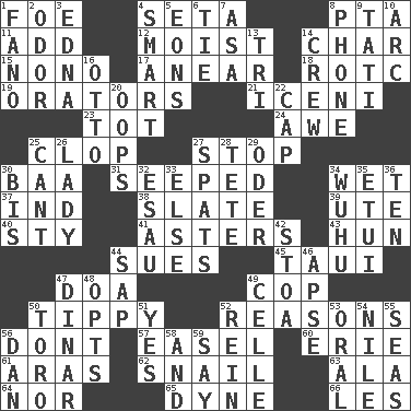 ACROSS 1. Enemy 4. Stalk of a moss capsule 8. Parent Teacher Assoc. 11. Increase 12. Wet 14. Burn to charcoal 15. Words to Nanette 17. Approach 18. College mil. group 19. Speakers 21. Ancient Celtic tribe of eastern Britain 23. Small child 24. Deep reverence 25. Hoof sound 27. Close up, plug up 30. Sound made by sheep 31. Oozed 34. Soggy 37. Working for oneself (abbr.) 38. Schedule 39. Shoshoni 40. Filthy place 41. Michaelmas daisies 43. Attila the _ 44. Takes to court 45. "Change" in Tahitian 47. ___ good deed 49. Police officer (slang) 50. Likely to tip or tilt 52. Thinks logically 56. Do not 57. Artist's stand 60. One of the Great Lakes 61. Ancient river in northeast Turkey 62. Slow-paced one 63. Insect wing 64. Not either 65. Unit of force 66. French article DOWN 1. Papal veil 2. Aroma 3. Pulitzer Prize-winning author Ferber 4. Don Adams' spy role 5. Immeasurably long periods of time 6. Neckwear 7. White ___ sheet 8. Give a jingle 9. Jacques of French films 10. Curve 13. Three (prefix) 14. Group working together 16. Von Bismarck 20. I made a mistake 22. Head covering 25. Patter 26. Kenny Rogers chart-topper in '80 27. Arguments over trivial matters 28. False hair 29. River in Europe 30. Twice 32. He sold his birthright 33. Otherwise 34. Chinese city south-southwest of Nanjing 35. Needle case 36. Nine, plus one 42. Portico 44. Plant excrement 46. Domed church section 47. Middle Eastern gold or silver currency 48. Elects 49. Cell (Danish) 50. "Corrida" creature 51. Consenting reply 52. It's straight from the horse's mouth 53. Taken by mouth 54. "Death on the ____" 55. Oceans 56. Daniel's nick name 58. Also 59. Declare
