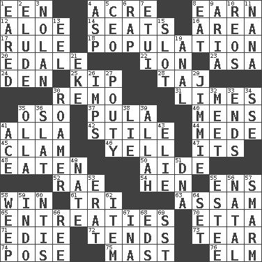 ACROSS 1. Car or cant ending 4. 1/640 square mile 8. Merit 12. Medicinal plant 14. Theater features 16. Type of rug 17. General guideline 18. Census information 20. Peak District village in England 22. Electrically charged atom 23. White ___ sheet 24. Lair 25. Monetary unit of Laos 28. _ Mahal 30. San ____ (Riviera town) 31. Citrus fruits 35. Bear (Spanish) 37. Monetary unit of Botswana 40. Not women's 41. Silent film actress Nazimova 42. Vertical member of a panel or frame 44. Ancient Persian 45. Dollar (slang) 46. Shout 47. It is 48. Eroded 50. Assistant 52. Actress Charlotte 54. Layer 55. Followers of ems 58. Victory 61. Three (prefix) 63. Indian state 65. Pleas 70. Singer James 71. Singer Brickell 72. Is inclined (to) 73. Separate forcefully 74. Introduce or present, as a question 75. Vertical spar for supporting sails 76. Shade tree DOWN 1. Having ears or earlike features 2. Evade 3. Pitcher Ryan 4. Viper 5. Corporate head (abbr.) 6. Reproach for some lapse or misdeed 7. Needle holder 8. Ingest 9. Operatic vocal solo 10. Vintage cars 11. Grandmother 13. Snakelike fish 15. Narrow, elongated depression 19. Of or related to the anus 21. Supplement with great effort 26. Naughty children 27. Marked by pouting 29. Stevie Ray Vaughan's brother 30. Nomad 32. Confront 33. Conclusions 34. Compass dir. 35. Water jar 36. Narrow board 38. Whopper 39. Assad's deity 41. Adept person 43. Writer Wiesel 49. Nathan's nickname 51. Heredity factor (abbr.) 53. Part of Q.E.F. 55. First name in cosmetics 56. Brizilian seaport 57. Excessive but superficial compliments 58. Shed a tear 59. _ china 60. Nuclear Threat Initiatives 62. A distinct part 64. Put into a specified state 66. To sift 67. _ tizzy (2 wds.) 68. Begley and Asner 69. Fast jet (abbr.)
