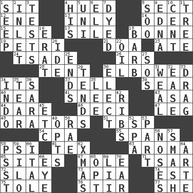 ACROSS 1. Be seated 4. Took on color 8. Religious group 12. Compass dir. 13. In an inward manner 14. River in Europe 15. Otherwise 17. Filth; sediment 18. Maid-servant 19. _ dish (used to culture cells) 21. ___ good deed 23. Had dinner 24. Sadhe (variant) 26. Big collection agency 28. Portable shelter 30. Turned at an angle; bent 34. ___ a Wonderful Life 37. Small valley 39. Burn superficially 40. Teachers' org. 41. Scornful expression 43. White ___ sheet 44. Have the gumption 46. Tenth: prefix 47. Part of a journey 48. Speakers 51. Cook's measure (abbr.) 54. Numbers guy (abbr.) 55. Connects, as a bridge 58. 23rd letter of the Greek alphabet 61. John Ritter's dad 63. Scent 65. Settings 67. Undercover agent 71. Russian ruler of old 72. Kill 73. Capital of Western Samoa 74. Eastern Standard Time (abbr.) 75. Lacquered or enameled metalware 76. Disorderly outburst 77. A female animal or person DOWN 1. Ooze 2. An arm off of a larger body of water 3. Trials 4. Part of HMS, perhaps 5. Corn or form start 6. Pipe bend 7. Colored 8. "Barney Miller" actor Jack 9. Pulitzer Prize-winning author Ferber 10. Penny 11. Family _ (genealogy) 16. Part of Q.E.F. 18. Sharp remark 20. Binary compound 22. Petroleum 25. Extremities 27. Distress signal 29. Watches over 30. Choose 31. Welt 32. Comfort 33. To trail on the ground 34. Southeast Asian peninsula 35. Pull into pieces 36. "Two Mules for Sister ____" 38. Area sheltered from the wind 42. Chest bones 45. And so on (abbr.) 49. Elects 50. Actress Charlotte 52. Health resort 53. Component 56. Olfactory organs 57. Box-office sellout 58. Inconspicuous attention getter 59. Grain storage tower 60. Slanted text style (abbr.) 62. Dec. holiday 64. Johnson of "Laugh-In" 66. Sight organ 68. Elect 69. Cards in a Roman deck? 70. Ewer handle