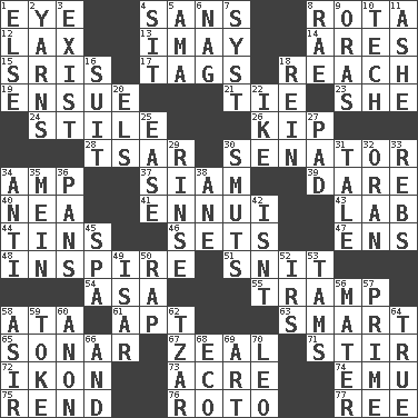ACROSS 1. Sight organ 4. Without 8. Round or rotation of duties 12. Not strict 13. "If ____ say so..." 14. Ancient Greek god of war 15. Indian titles of respect 17. Labels 18. Arrive at 19. Take place subsequently 21. Neckwear 23. A female animal or person 24. Vertical member of a panel or frame 26. Sleep 28. Russian ruler of old 30. Legislator 34. Electrical Unit 37. Thailand, formerly 39. Have the gumption 40. Teachers' org. 41. World-weariness 43. Experiment locale 44. Airtight sealed metal containers 46. Arranges properly for use 47. Followers of ems 48. Heighten or intensify 51. In a ____ (agitated or irritated) 54. White ___ sheet 55. _____ steamer (cargo ship) 58. "One Day ___ Time" 61. Fitting 63. Don Adams' spy role 65. Underwater navigation system 67. Ardor 71. Commotion 72. Picture 73. Measure of real estate 74. Australian flightless bird 75. Tear apart 76. Printing process, for short 77. Portuguese money of account (variant) DOWN 1. Otherwise 2. Entertaining tales 3. Be extant 4. Be seated 5. Nanny (var.) 6. Tired old horse 7. System (abbr.) 8. Actress Charlotte 9. Mouths or openings 10. Georgia ____ (Atlanta school) 11. American tennis player Robert 16. Set of matching outer garments 18. It's straight from the horse's mouth 20. Raised railways 22. Eisenhower's nickname 25. Relaxation 27. Writing tablet 29. Remove soap 30. Particles of soot 31. Falsehood 32. NW Algerian seaport 33. Confederate soldiers (slang) 34. Opposed to 35. Count _ (2 wds.) 36. Baking dishes 38. One (Scot) 42. Is not 45. Health resort 49. Austrian river, tributary to the Danube 50. Reproach for some lapse or misdeed 52. Big collection agency 53. Scottish caps 56. Mother 57. First class 58. SW Saudi Arabia district 59. Puff or smoke 60. At once, immediately (arch.) 62. Russian ruler 64. Loyal 66. Added to 68. Environmental prefix 69. Nonscientific branch of learning 70. Lion