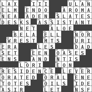 ACROSS 1. Not strict 4. One more than two 7. ____ Bator 11. Shade tree 12. Inside; within (prefix) 13. Odor 14. Teachers' org. 15. Arabian gulf 16. Chalkboards 17. Writing tables 19. Aide 21. Fish or hair follower 23. _ vera 24. Actor Lugosi 25. Pipe bend 26. Not either 29. Take or capture by force 30. Mountains (abbr.) 31. RI univ. 32. Period 33. French article 34. June honoree 35. Put into a specified state 36. Car or cant ending 37. Fertile tracts in a desert 40. Followers of ems 41. Added to 42. Nuclear Threat Initiatives 43. Australian parrot (variant) 45. Period of immesurable duration 46. Dwelling 51. Crowbar 55. Spoke pompously 56. Relating to the mouth 58. Compass dir. 59. Hauls 60. Lubricates 61. Binary compound 62. SW Saudi Arabia district 63. Allow 64. Science/research agcy. DOWN 1. Grant temporary use of 2. Toward shelter 3. Dec. holiday 4. Indiana (abbr.) 5. The main thing one is thinking about 6. Charged particles 7. A salt of uric acid 8. Globular water bottle used in Asia 9. So be it 10. Political cartoonist Thomas 12. Artist's stands 13. In addition 16. Beverly of Met fame 18. Leg joint 20. Table seasonings 22. Make lace 24. Naughty children 25. Make improvements or corrections to 26. Unclothed pictures 27. Mouths or openings 28. To free from 29. Songbird 32. Compass dir. 33. Soviet premier 1918-24 36. Having ears or earlike features 37. Single 38. Ringlike coral islands and reefs 39. Trig term 43. 61 cubic inches 44. Lyric poems 46. Round or rotation of duties 47. Greek god of love 48. Suttee (variant) 49. Calm and collected 50. One of the Great Lakes 52. Distinctive style or manner 53. Conclusions 54. Coral ridge 57. Keyboard modifier key